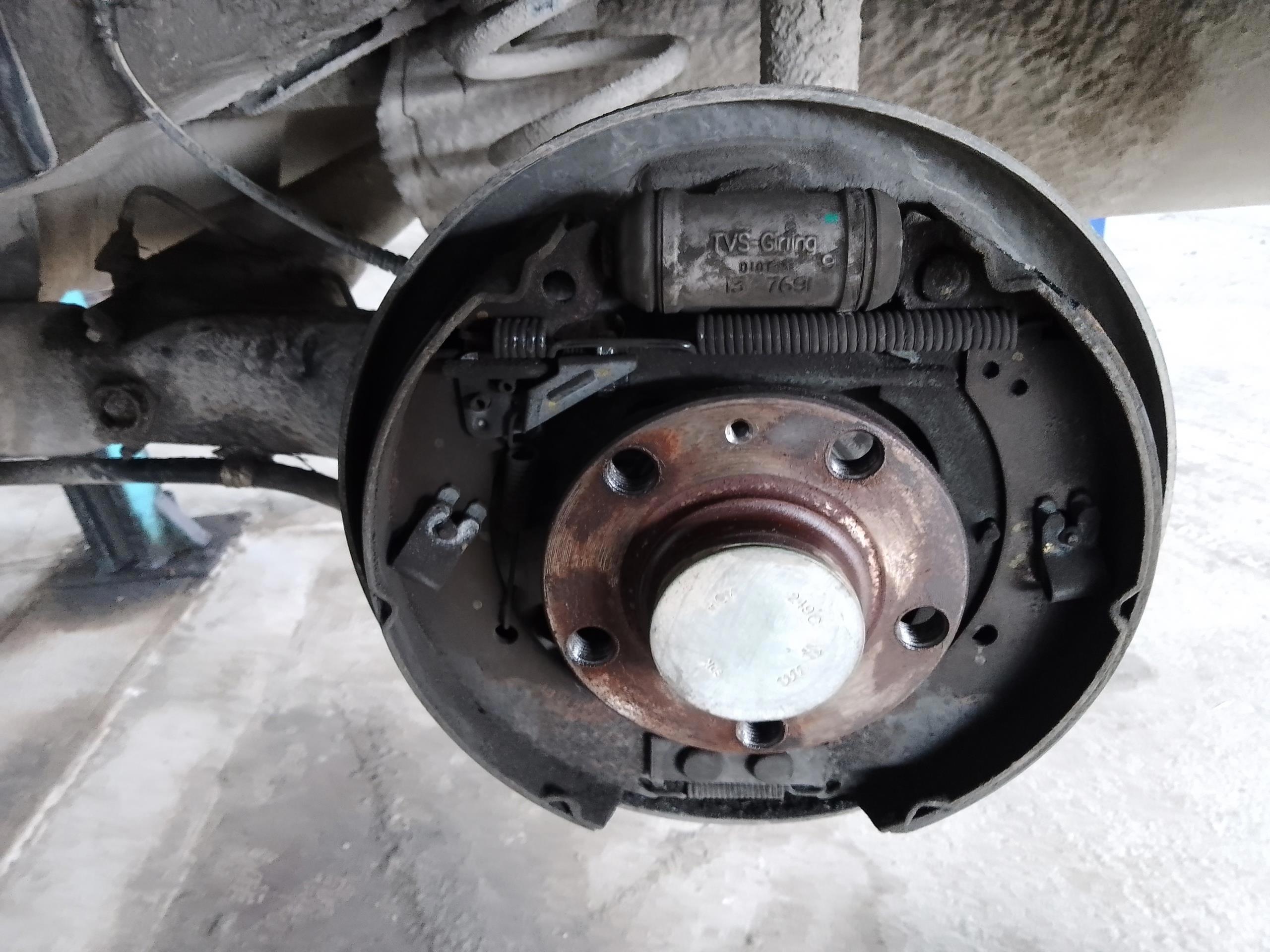 Второй в нашем списке - Фольксваген Поло, 16 года. Преследуют меня эти подарки Гитлера... Приехал он на замену колодок в круг, но осмотр передних тормозов показал, что там колодок ещё 50%, и мервые тормозные диски, поэтому колодки ставить не стали, а сказали, что как дотрёт их - приедет с дисками. Сзади - барабаны. Барабанный тормоз необычайно хорош собой, но в обслуживании это лютый трэш... Особнно, если нет регулировки сведения колодок. У этого Поло она есть. Повезло повезло! Обстукиваем прилипший к ступице барабан, наливаем жидкий ключ по все дырки, ждём, и лупим в эти два места, чтобы рашатать барабан. Но! Лупить надо с умом, иначе барабан придётсявыкинуть. Без фанатизма.