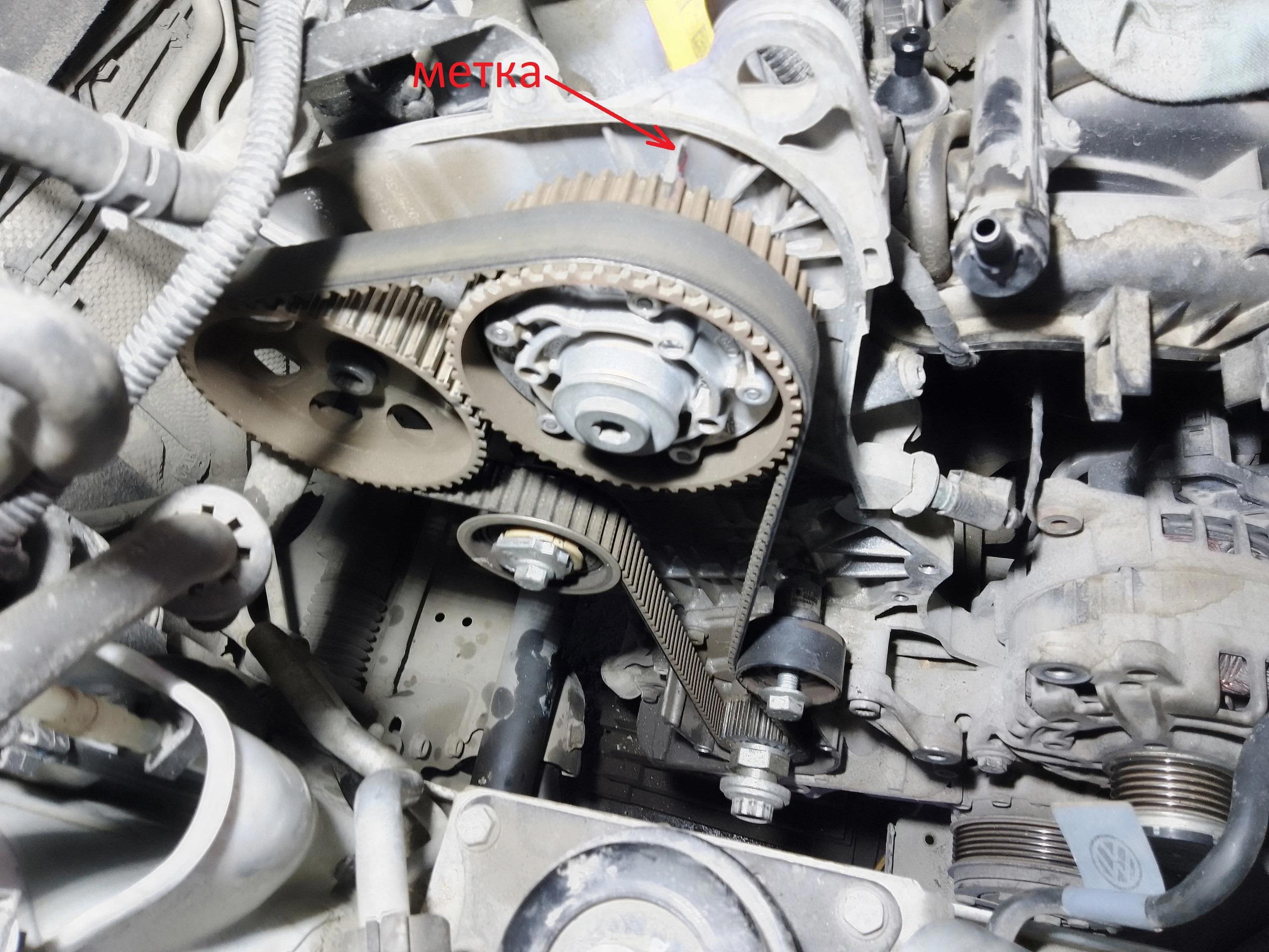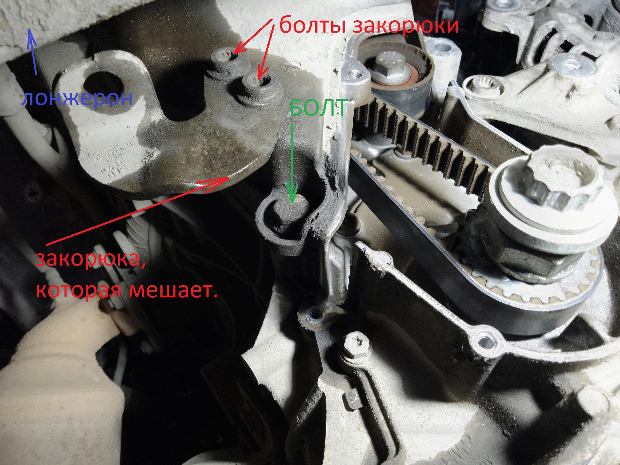 Метка на шестернях между валами очень помогает, всем рекомендую ее делать. Заодно замечаю, что кто-то тут уже ставил метки. Снимаем нижний шкив коленвала, нижнюю крышку ГРМ, и хотим отвернуть болт средней крышки, он же кронштейн опоры двигателя. А не тут-то было! Открутить этот болт мешает закорюка! На 1.4 она тоже была, ток другой формы. К этой фигне не крепится ни-че-го, она просто мешает.