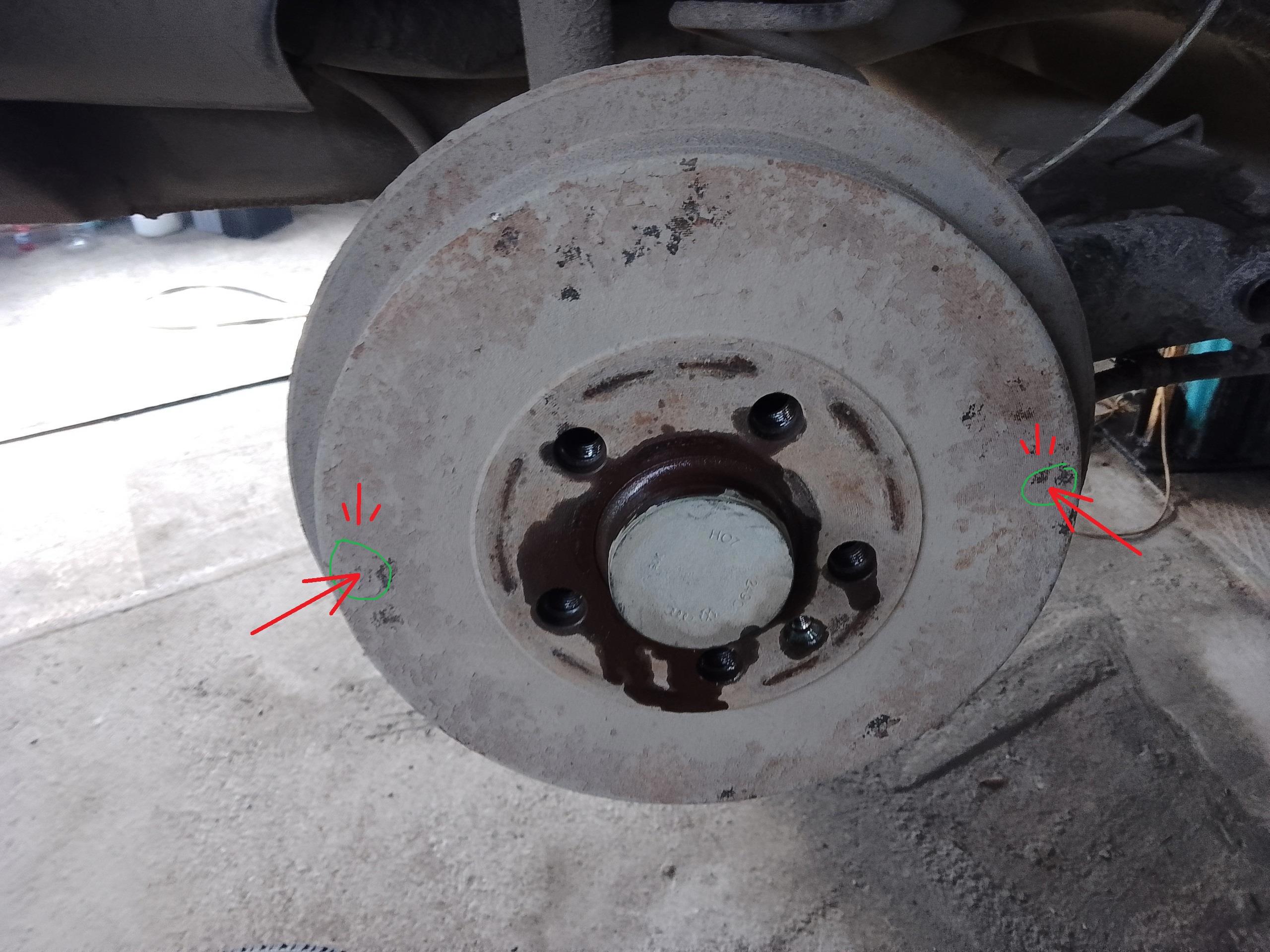 При этом видим, что колодка слева (обращенная к передней части) тонкая, а справа (задняя) - вплоне толстая. С обеих сторон ситуация идентичная... Не знаю, почему так.
