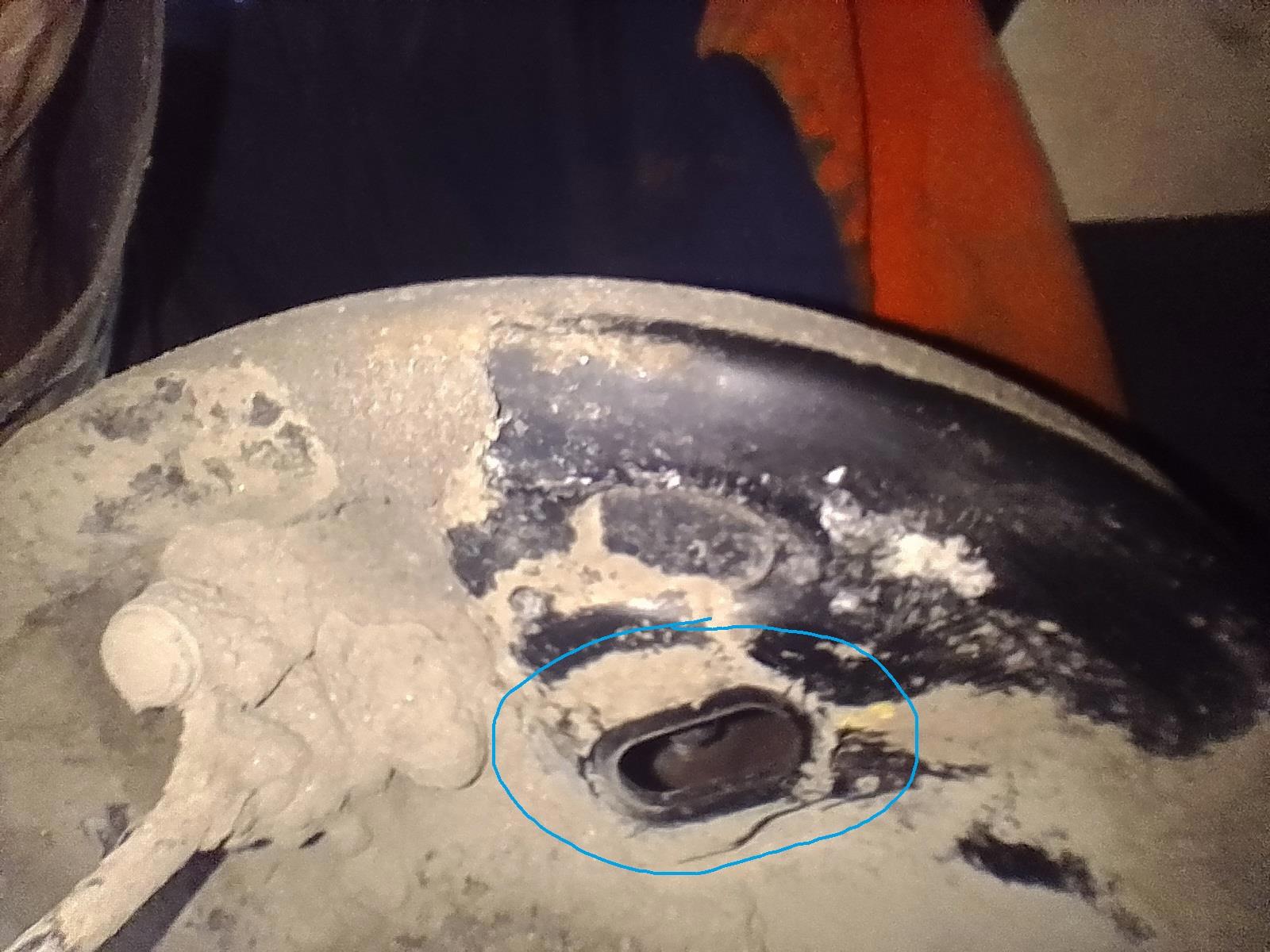 А вот это дырка с обратной стороны тормозов, обычно она закрыта резиновой затычкой (уже выковыряно), и служит для доступа к механизму регулировки колодок. Не у всех она с тыла, у некоторых сделана прямо в барабане. Ищем зубчатое колесо регулировки и крутим в какую нибудь сторону. Если барабан перестал крутиться - значит мы развели колодки, надо крутить в другую. Регулировку, кстати, произвожу так: кручу до тех пор, пока барабан не перестал вращаться, а потом возвращаю чуть назад. Нам надо свести колодки, чтобы они не цеплялись за выработку в барабане.