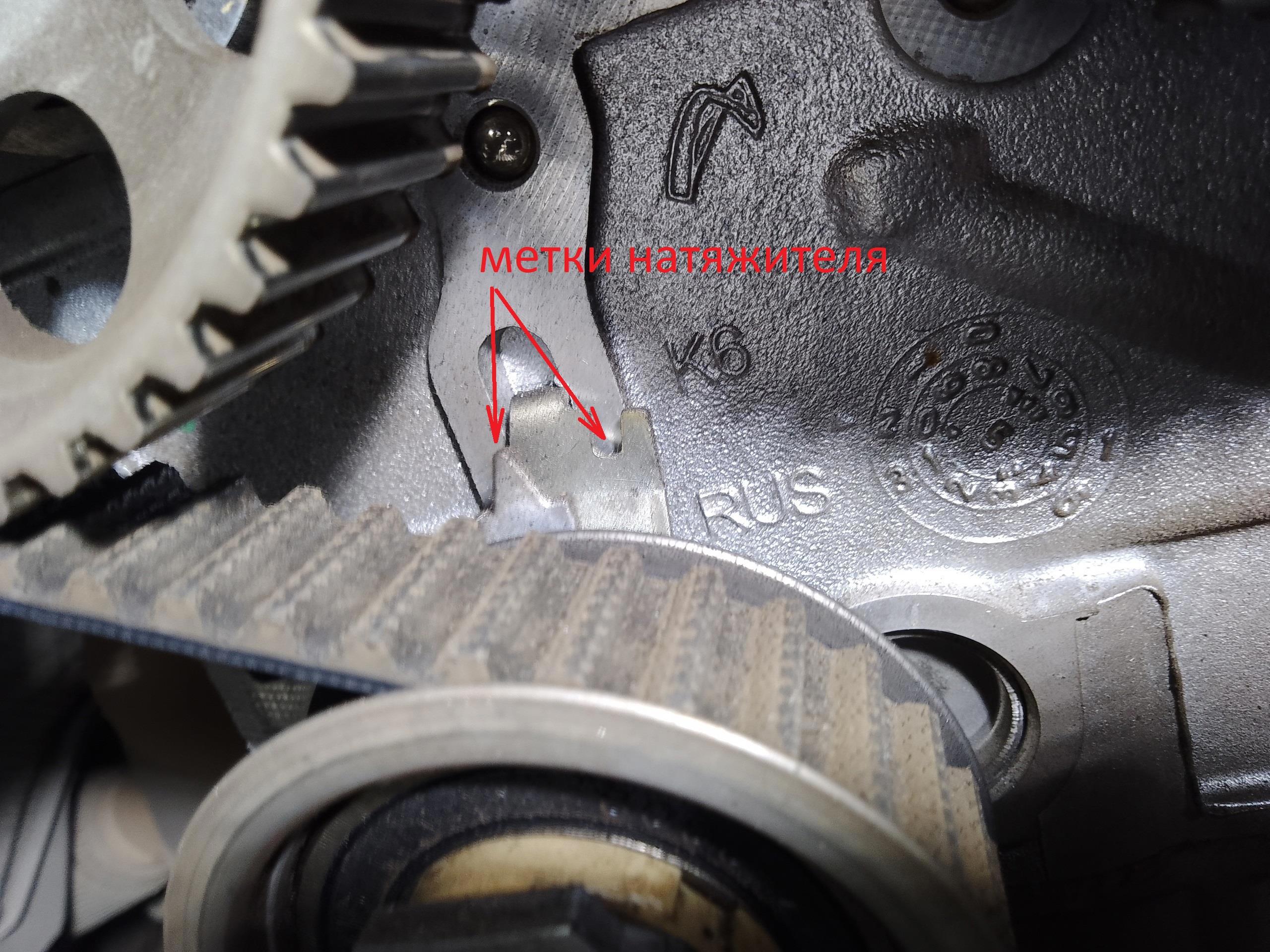 Сняв кроншейн, видим, что метки натяжителя ремня ГРМ разошлись. Вообще, ремень этот не вытягивается. Есть выработка на шкивах привода, но она минимальная. Неправильная установка?..