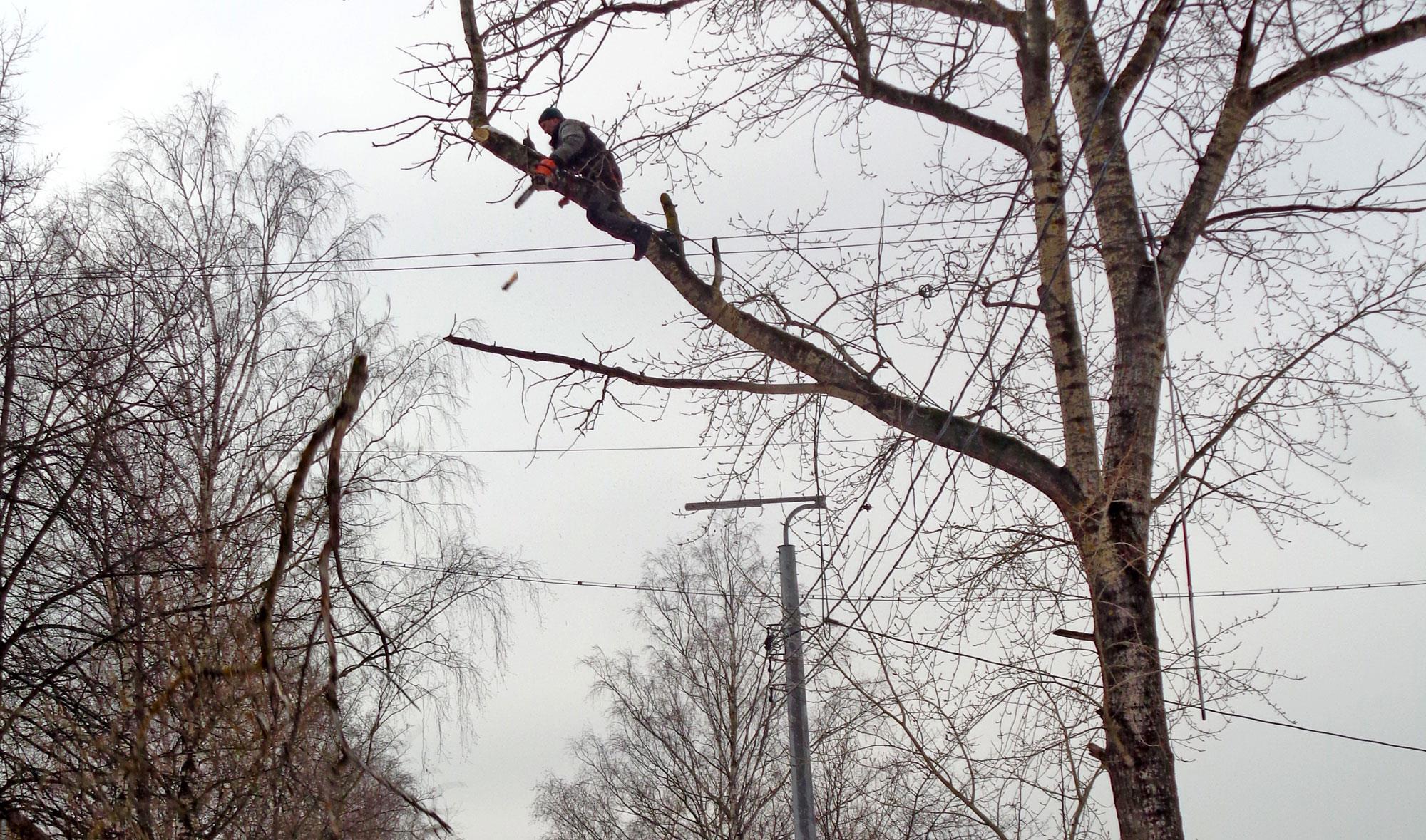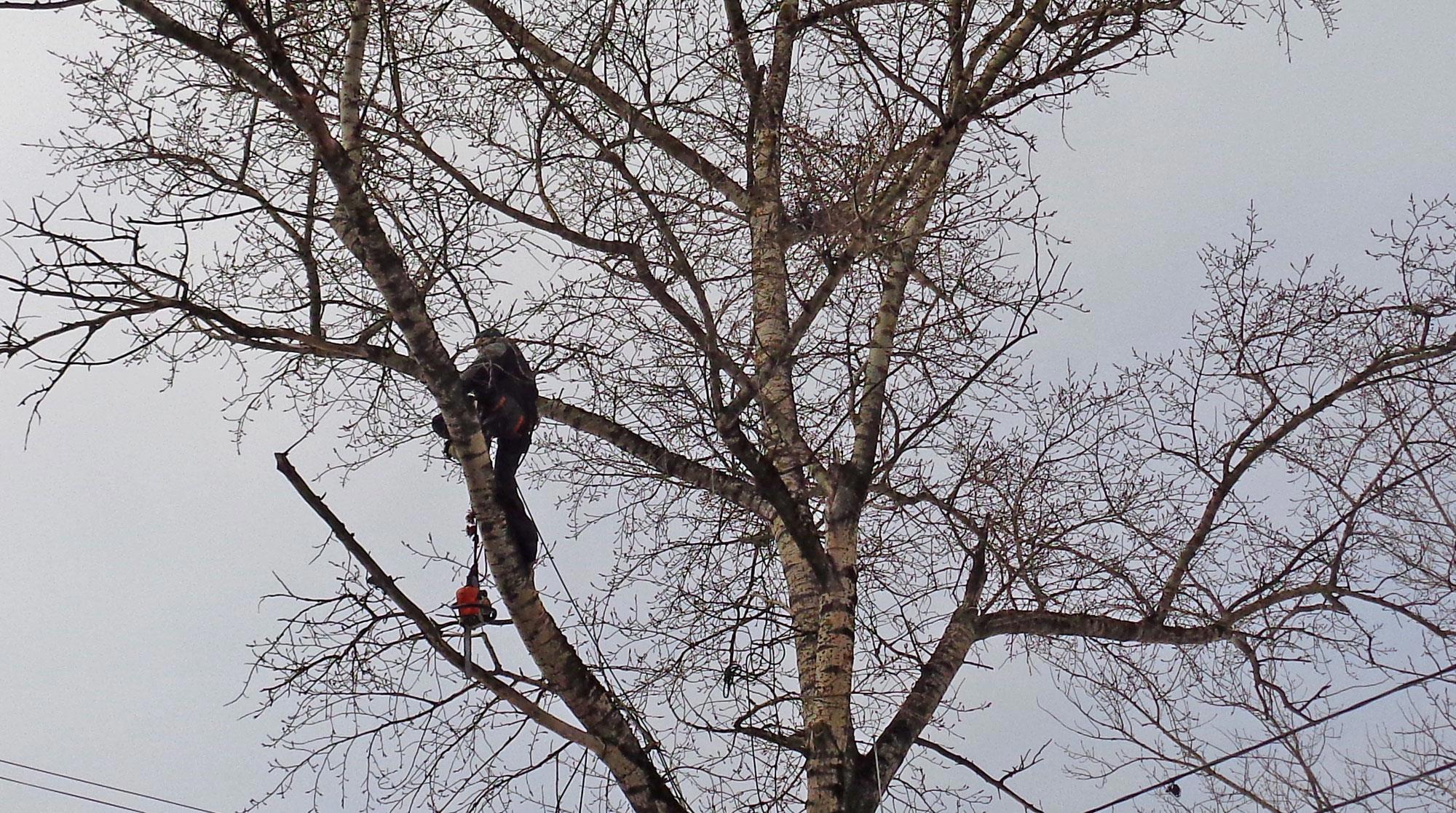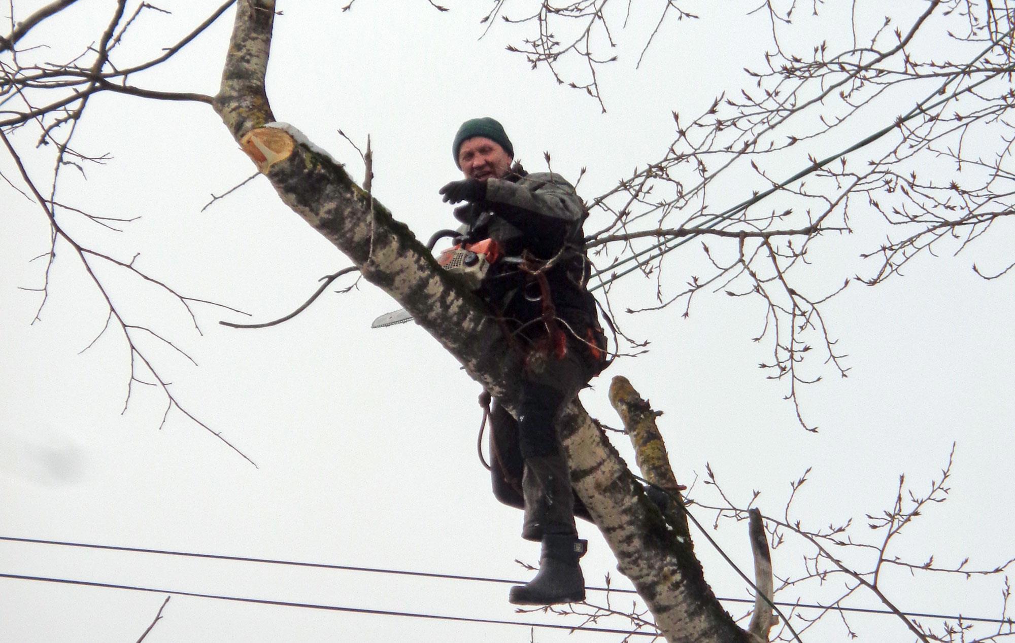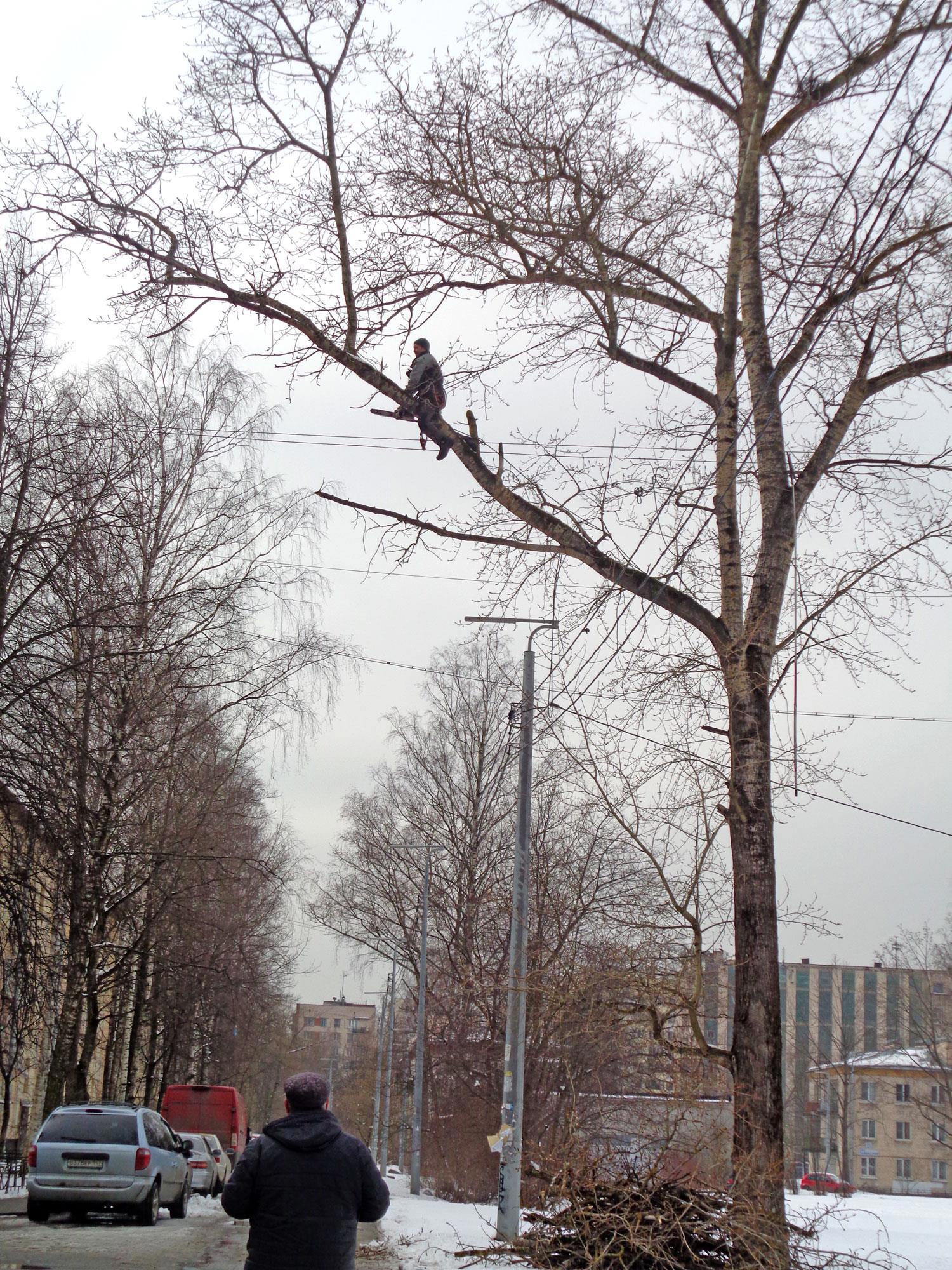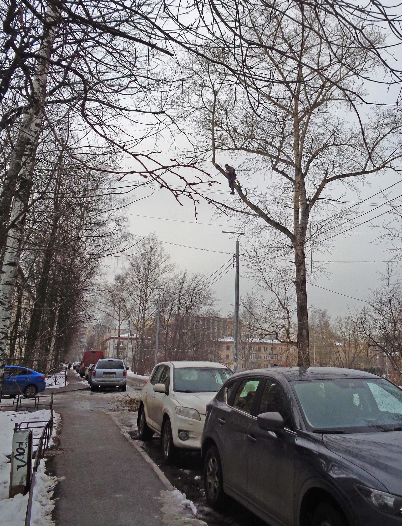 Автор: Маргарита ГуминенкоПосвящается "Безумству храбрых". Идём от МФЦ к улице Тамбасова, а там мужик на высоченном тополе, ветки обпиливает. Сперва он вообще стоял во весь рост, потом ему стали снизу что-то кричать и он сел на ветку верхом. Он конечно со страховкой, но если рухнет вниз со своей бензопилой - всё равно неприятно. А дерево очень хрупкое, когда сучья вниз падают - разбиваются на кусочки.