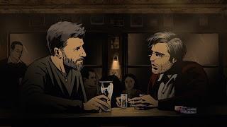 Грустный взгляд курящего мужчины в очках смотрят на своего друга. Затяжка и.. - Пришлось узнать. - Выпитый шот лишь подтверждало то, что товарищу Ари было достаточно больно вспоминать об этом. Очередная посиделка в баре поздним вечером была весьма хорошей затеей для светских разговоров о жизни. Или о воспоминаниях из жизни. Такой очередной вечер стал весьма серьёзным началом к тому, во что ввяжется Ари Фольман (сидящий слева).