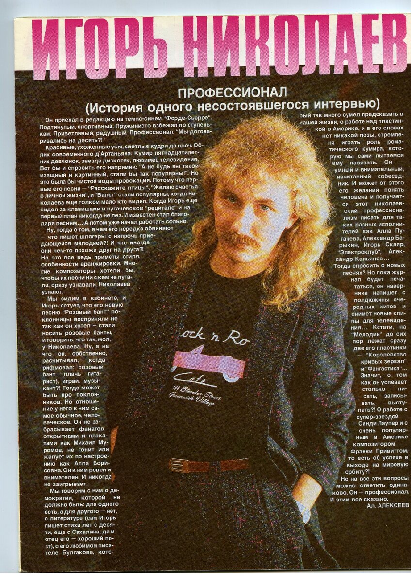 Владимир Пресняков, Дмитрий Маликов, «Ласковый май», «Мираж», Игорь Николаев — вот ново-хаммеровский пантеон железных «героев» рока. Видно, не очень надеясь на свою аудиторию, авторы решили привлечь и массы любителей попса. Посмотрим, что за горячие новости раздобыли для нас отечественные рок-журналисты? О том же Николаеве, усердно тиражируемым нашим пока бесплатным ТВ. Господин издатель, прочтите вместе с нами «Профессионала» Ал.Алексеева! На протяжении всего повествования журналист раздумывает, о чем же спросить этого молодого человека с «красивыми уложенными усами и светлыми кудрями до плеч», приехавшего «в редакцию на темно-синем «Форд-Сьерре». Цитирую, кстати, единственную информацию, почерпнутую из опуса. Да и то сказать насчет усов: видели уж, видели! А далее корреспондент выдавливает из себя: «А не будь вы такой изящный и картинный, стали бы так популярны?». Стиль-то, стиль! Совсем как у Николаева, о котором товарищ Алексеев сообщает, что тот «пишет шлягеры с напрочь (? — С.Д.) приедающейся мелодией», и что песни его «иногда чем-то похожи друг на друга». Но, может быть, стоит в следующий раз, прежде чем взяться за «паркер», взглянуть в семантический словарь. Чтобы хоть не путать значения слов «напрочь» и «накрепко», «одинаково» и «однозначно».""