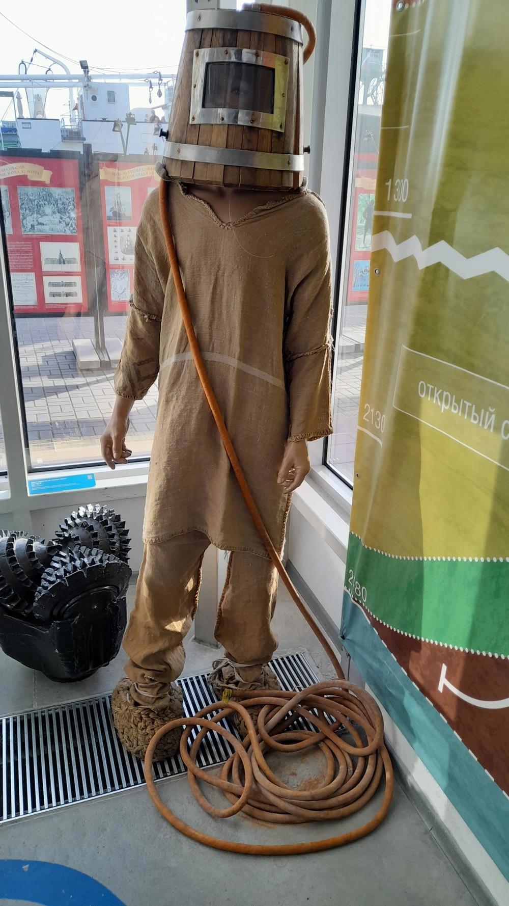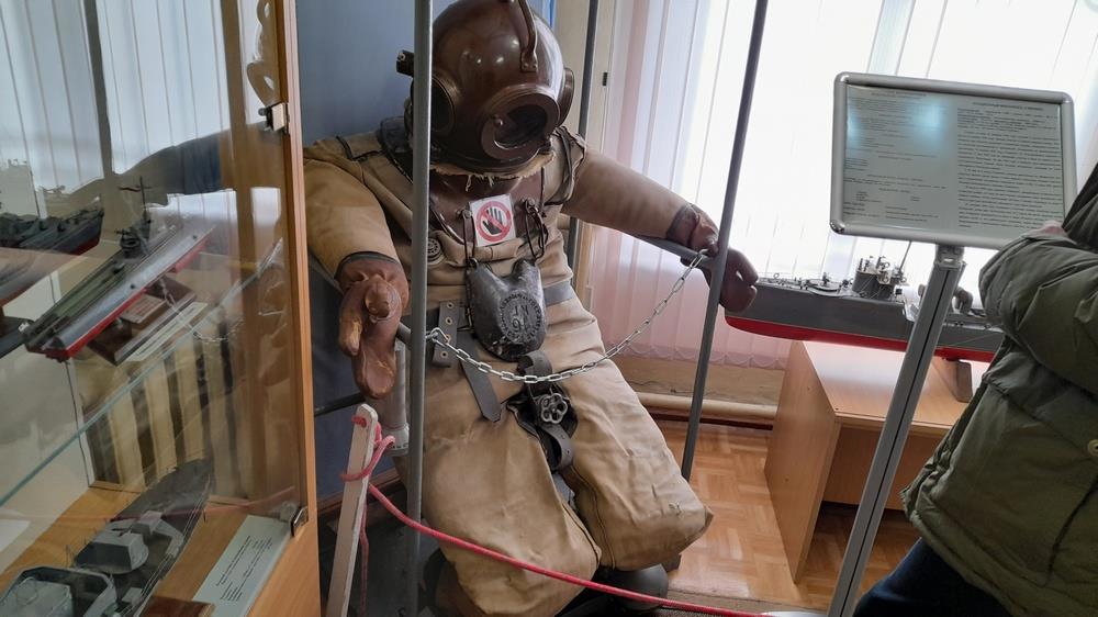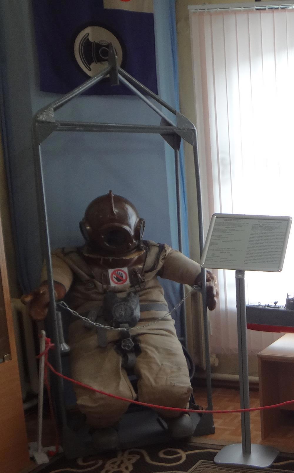 Балтийский музей ВМФ, водолаз в трехболтовом снаряжении в водолазной беседке сидит
