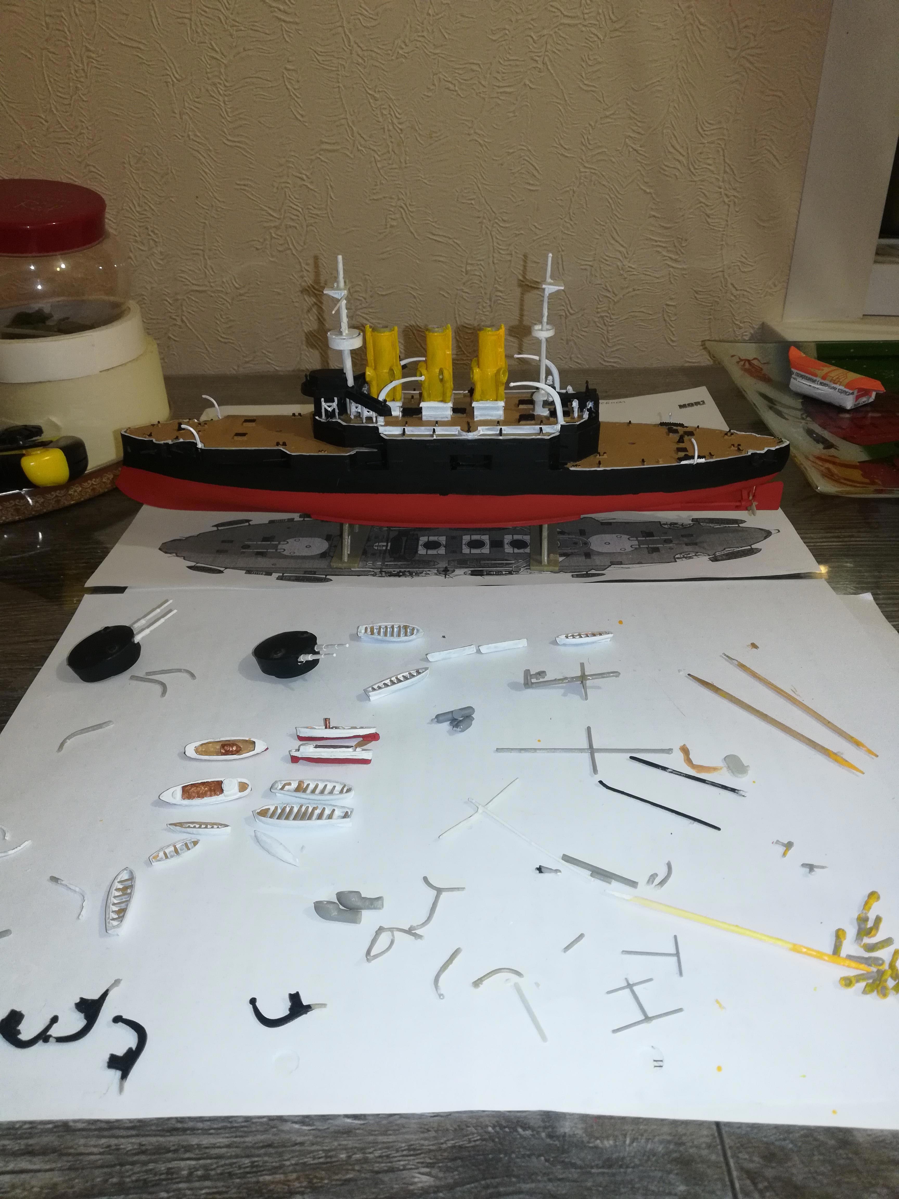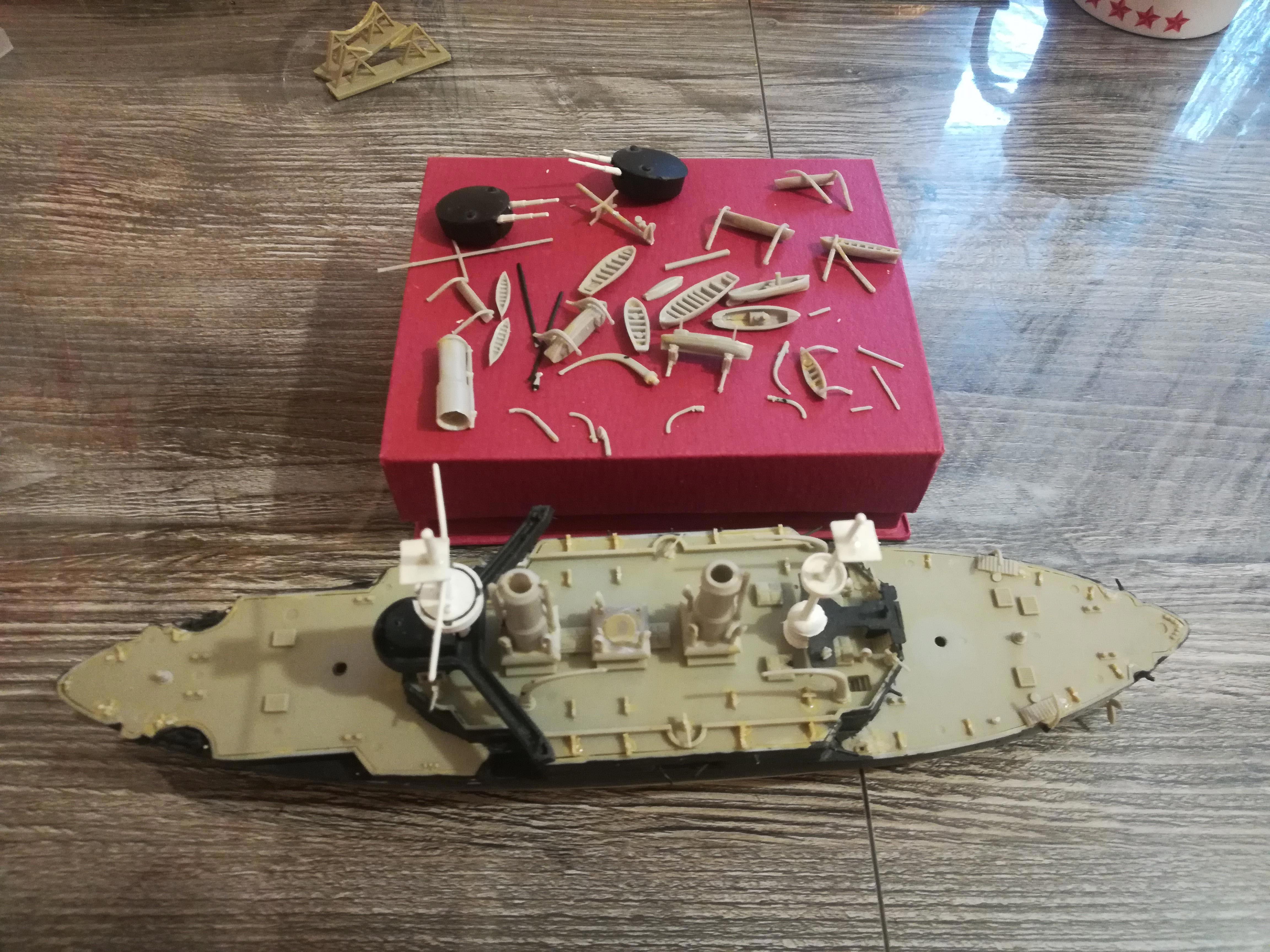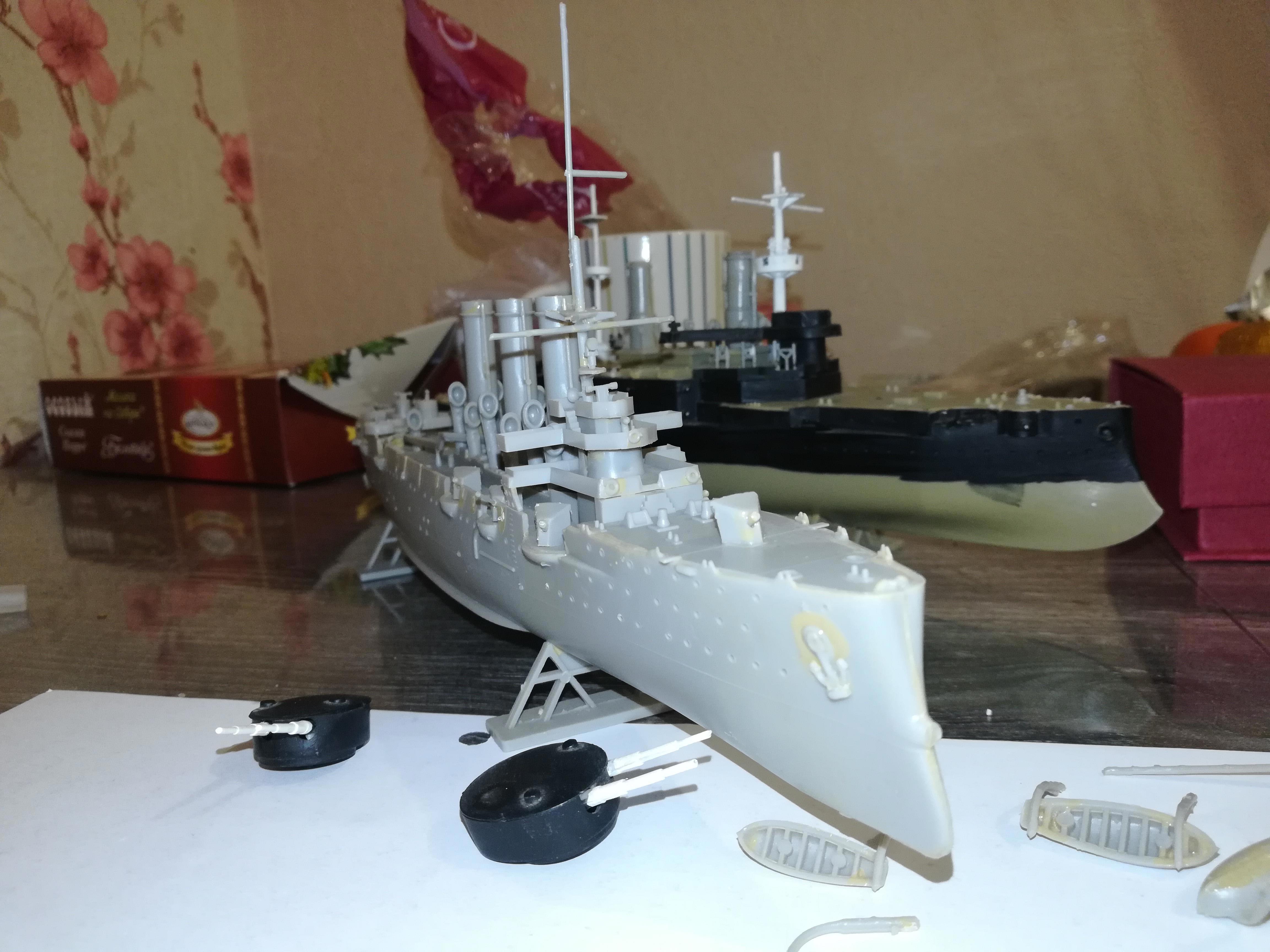 Прикинул схему сборки, глянул пару фоток настоящего корабля и понял, что деталей точно не хватает. Зато есть модель крейсера «Аврора», в том же масштабе. «Аврора» так же участвовала в сражениях с моим сыном и была главным претендентом на экспедицию в мусорное ведро. С помощью скальпеля удалось превратить крейсер в целую кучу запасных частей и заготовок.