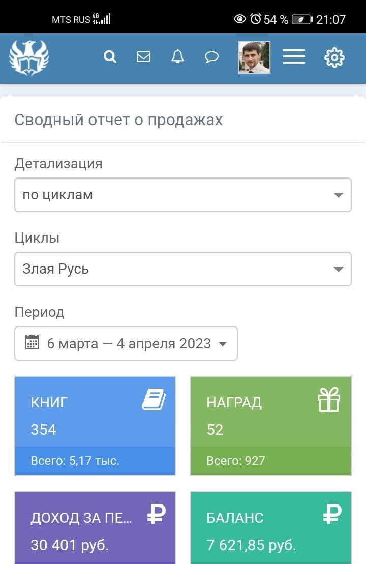 Так что я решил вернуться к рекламе, и обратился к своему другу Владу Садовому с очередным заходом на рекламу. Весной прошлого года я уже пользовался его услугами, о чем ранее писал. Тогда коэффициент прибыли составил 1,6 (вложил 15, снял чуть более 24), но в этот раз мы стартанули с рекламой уже на полный цикл из 5 книг "Злая Русь". И... Я немножко слукавил, написав в заголовке, что вложил 15000 рублей, а получил на цикле 30. На самом же деле ещё идут последние дни рекламы, так что заработанная сумма со старта продаж 6 марта до конца не определена. На настоящий же момент статистика следующая: