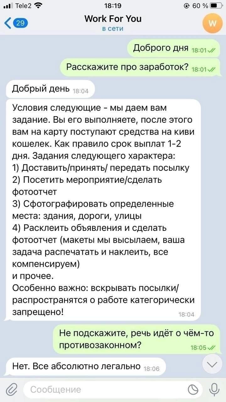 При этом добрый куратор конечно же объяснит, что все законно и ничего страшного не произойдет. Поначалу. А потом слова "Я не знал, что в коробке" в суде не помогут.