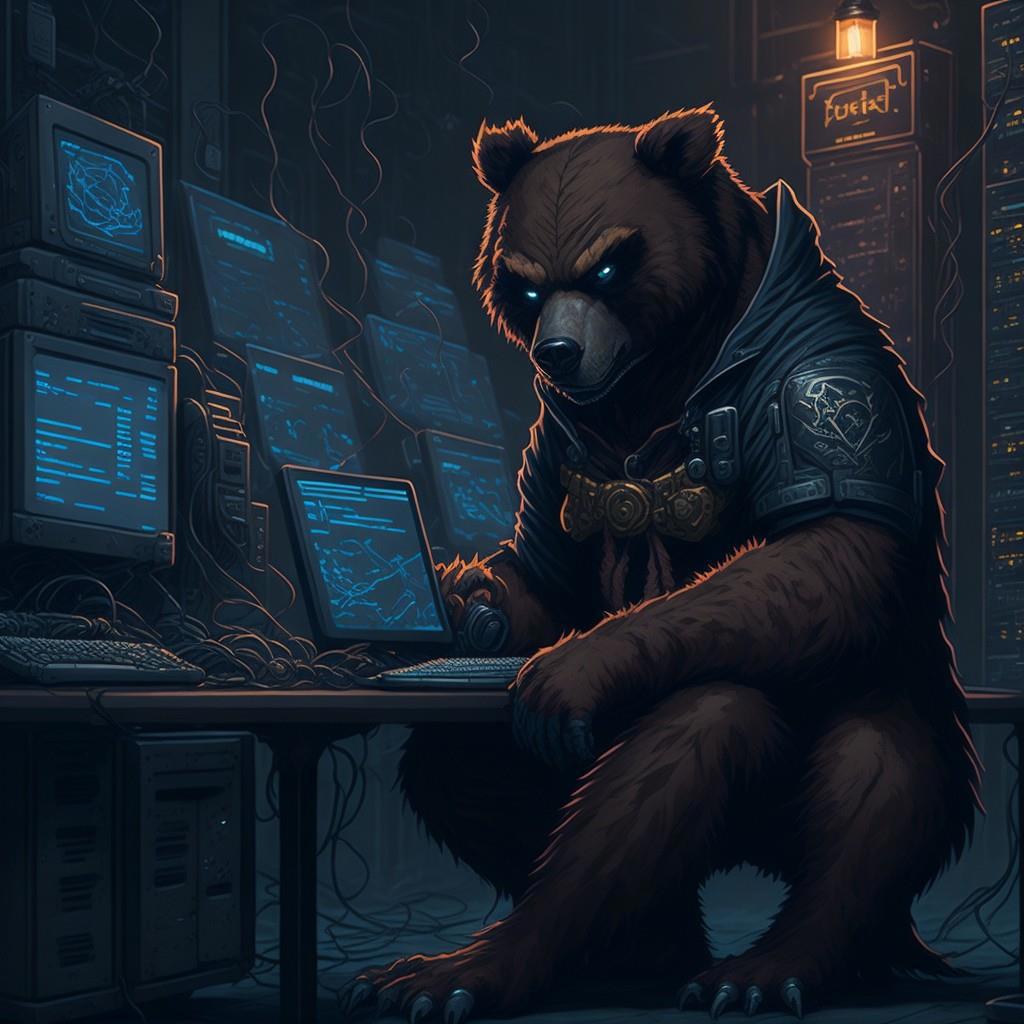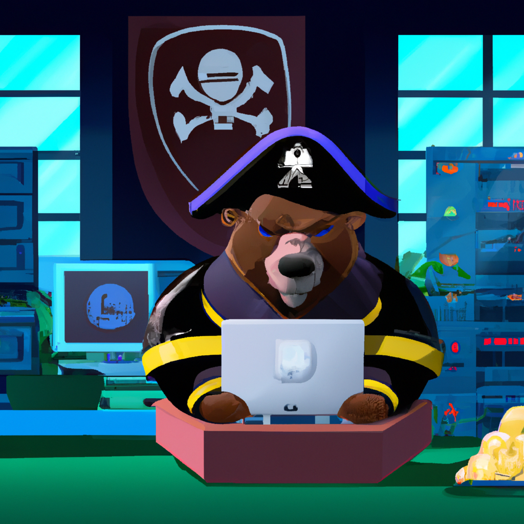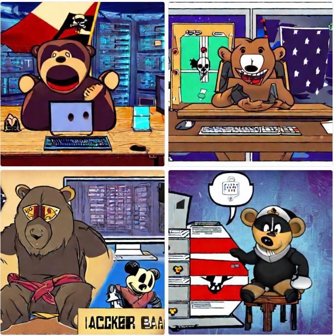 hacker bear is sitting at a computer against the background of a pirate flag, behind his back is a huge server room and defeated enemies Marvel and Disney