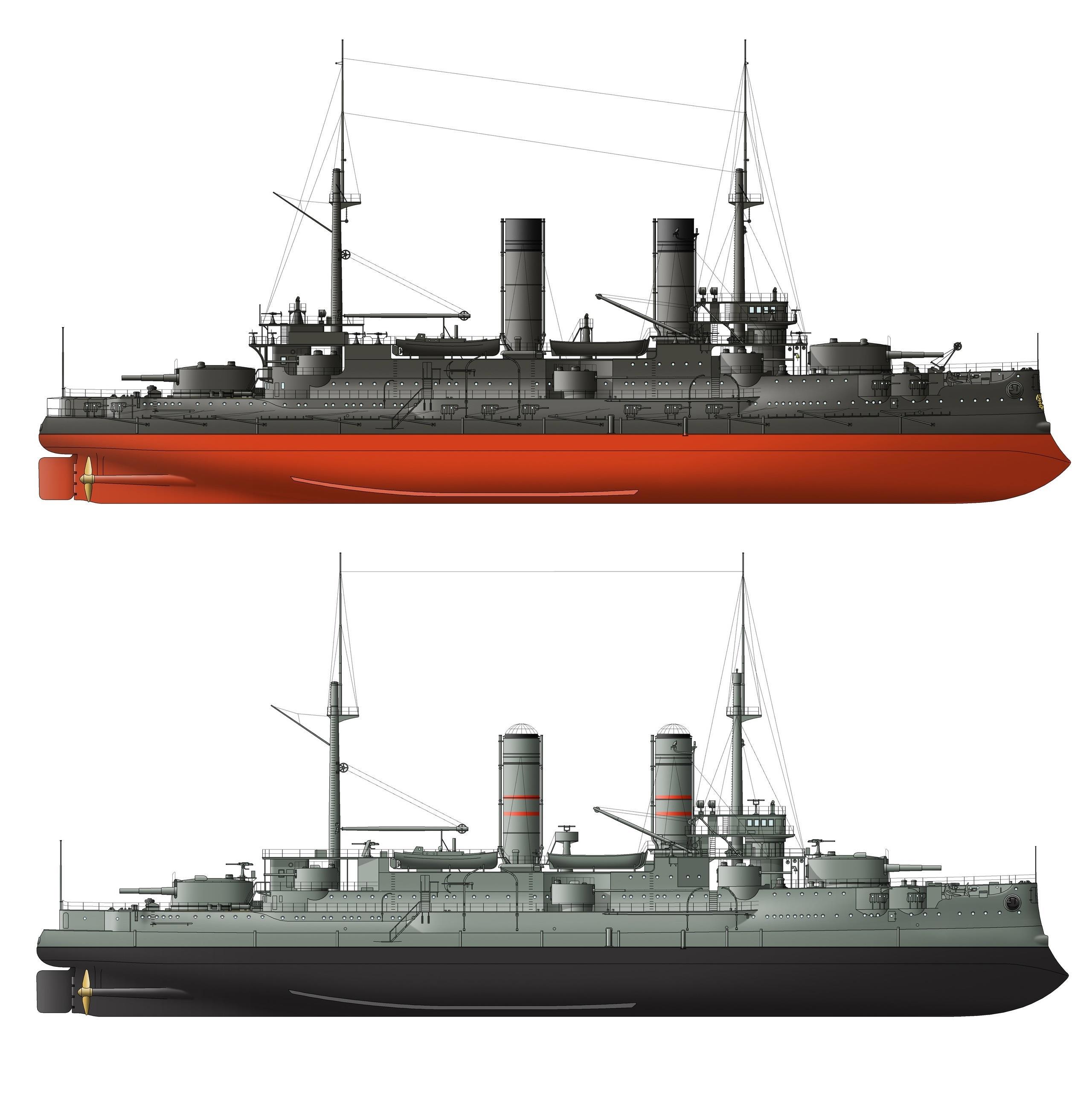 И вот сегодня Сергей Патянин (известный историк в области флота, кстати) поделился прекрасной иллюстрацией за авторством А.Дашьяна: "Слава" на период постройки и в 1917 году: