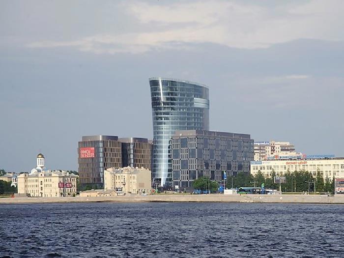 Бизнес-центр «Санк-Петербург плаза» выстроенный под себя одноименным банком за характерную форму и сплошное остекление именуется «дом-чайник»: