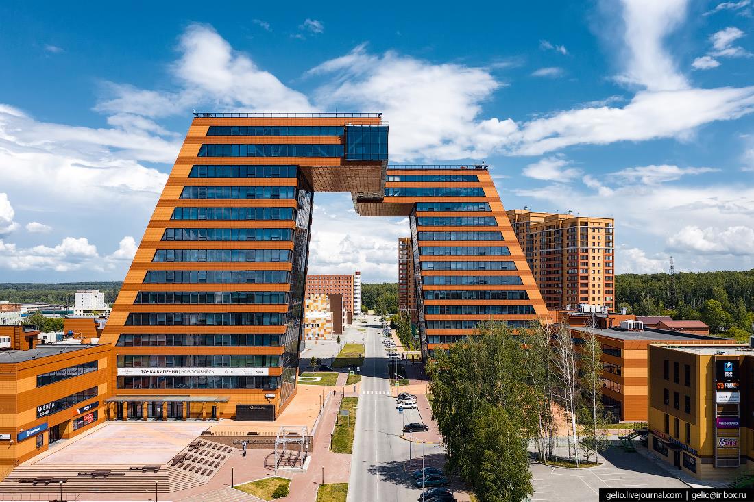 За своеобразный ракурс здания технопарка Новосибирского Академгородка, соединенные на уровне 13-14 этажа перемычкой, получили прозвище «гуси»: