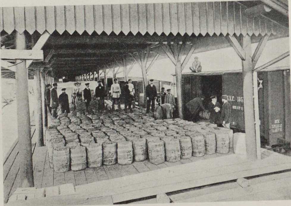 Погрузка масла в вагоны на ст. Курган Сибирской железной дороги 1906-1908 год.