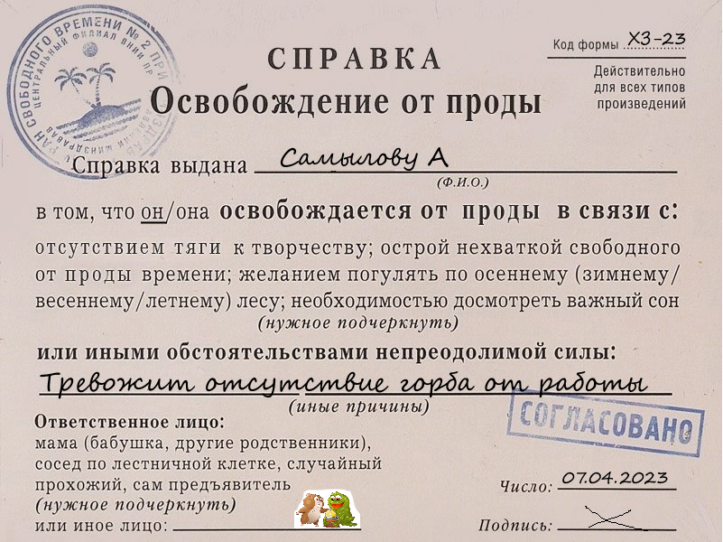 Автор: Самылов АлексейДрузья! Мне необходимо плотно поработать на этих выходных. Примерно до среды-четверга буду зарабатывать орден сутулого. Поэтому прод не будет. Справка ниже)))