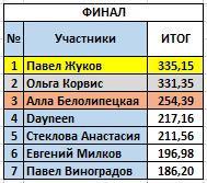 ![]() | Угадайка 12 участников попытались предсказать количество конкурсантов. Получилось, как вы помните, у троих: Shahzod Kenjayev – 31 Якунина Марина– 28 Алла Белолипецкая – 33 Да-да, Shahzod Kenjayev оказался снайпером в этом деле и попал в яблочко!!! Поздравляю!!! ![]() |