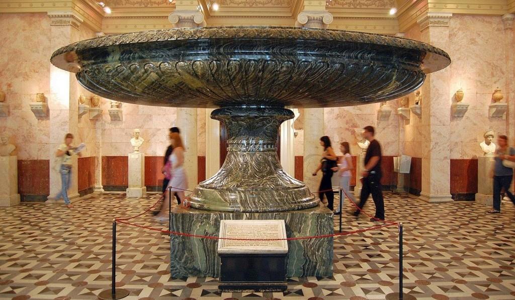 Вернёмся, однако, на Родину. Вот изделие, которое называют колыванской вазой. Просто сделана она была там в начале 19 века. Материал – монолитный кусок яшмы. Масса – около 19 тонн.
