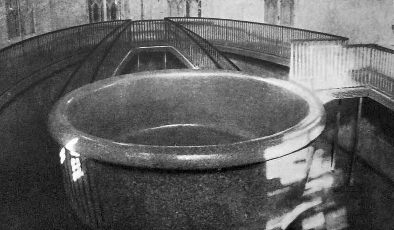 А тут без всяких танков по болотам протащили 160 тонн, то есть в два с половиной раза больше. Странновато как-то... не находите? Ладно - притащили и начали махать молотками, значит. В результате трудов под руководством Самсона Суханова в течении 10 лет от этой массы осталось каких-то 48 тонн полированного гранита. Размеры, впечатлившие экспертов Гиннеса, следующие: диаметр – 533 см, общая высота – 196 см при глубине 152 см, ёмкость – 12 кубометров воды. Говорят, что толщина стенок ванны – 45 см. Опять же, говорят, что если бы толщина стенок была бы чуток поменьше, то они бы не выдержали давления воды. Проверить не могу – характеристик материала не знаю. Интересно, откуда их знают те, кто говорит о предельности конструкции. Очень похоже, что это – элемент рекламы для туристов. Вот это вот чудо поставили на маленький постамент, а вокруг возвели стены башни. Для доступа и осмотра изделия имелись чугунные лестницы и площадки. Вот они на снимке 30 годов:
