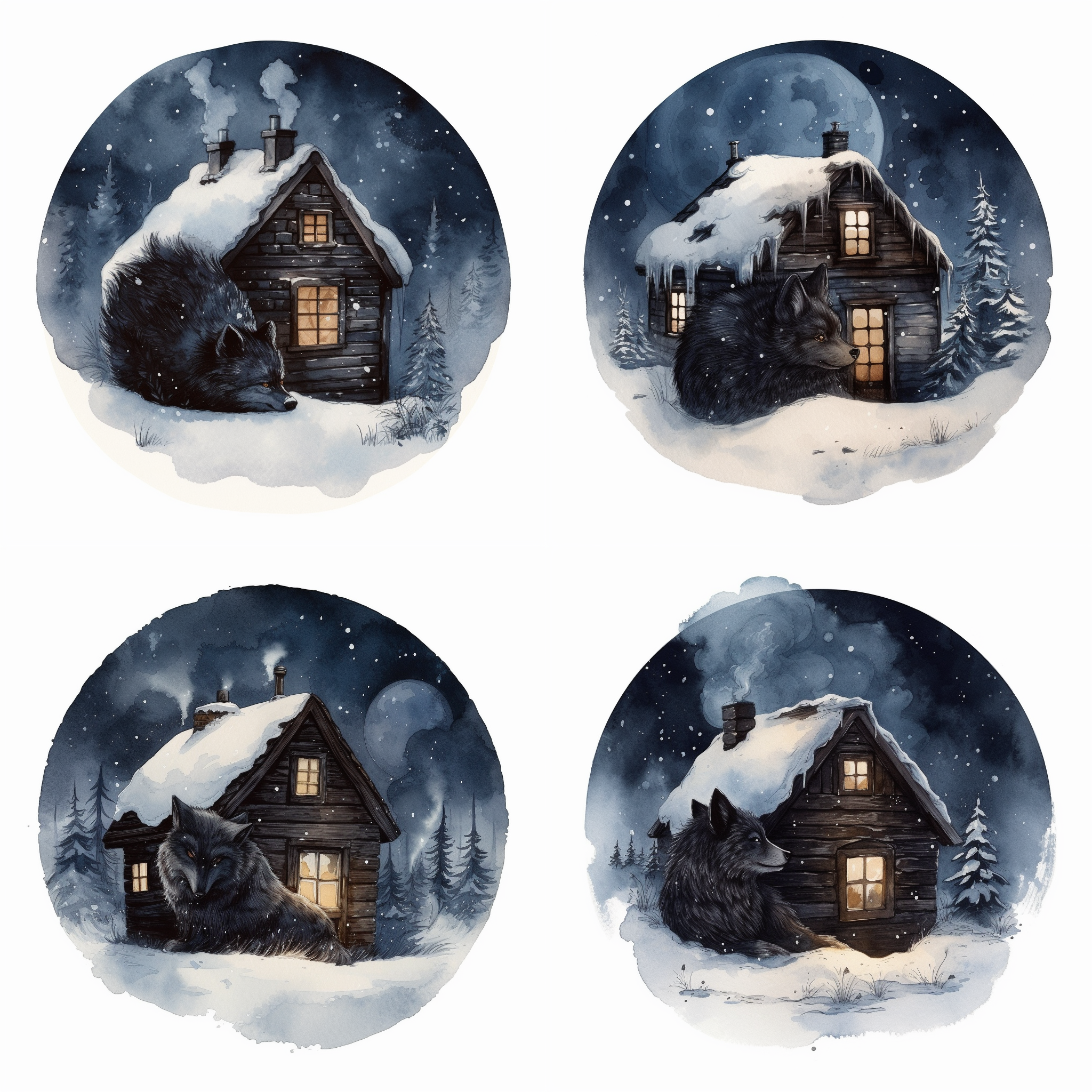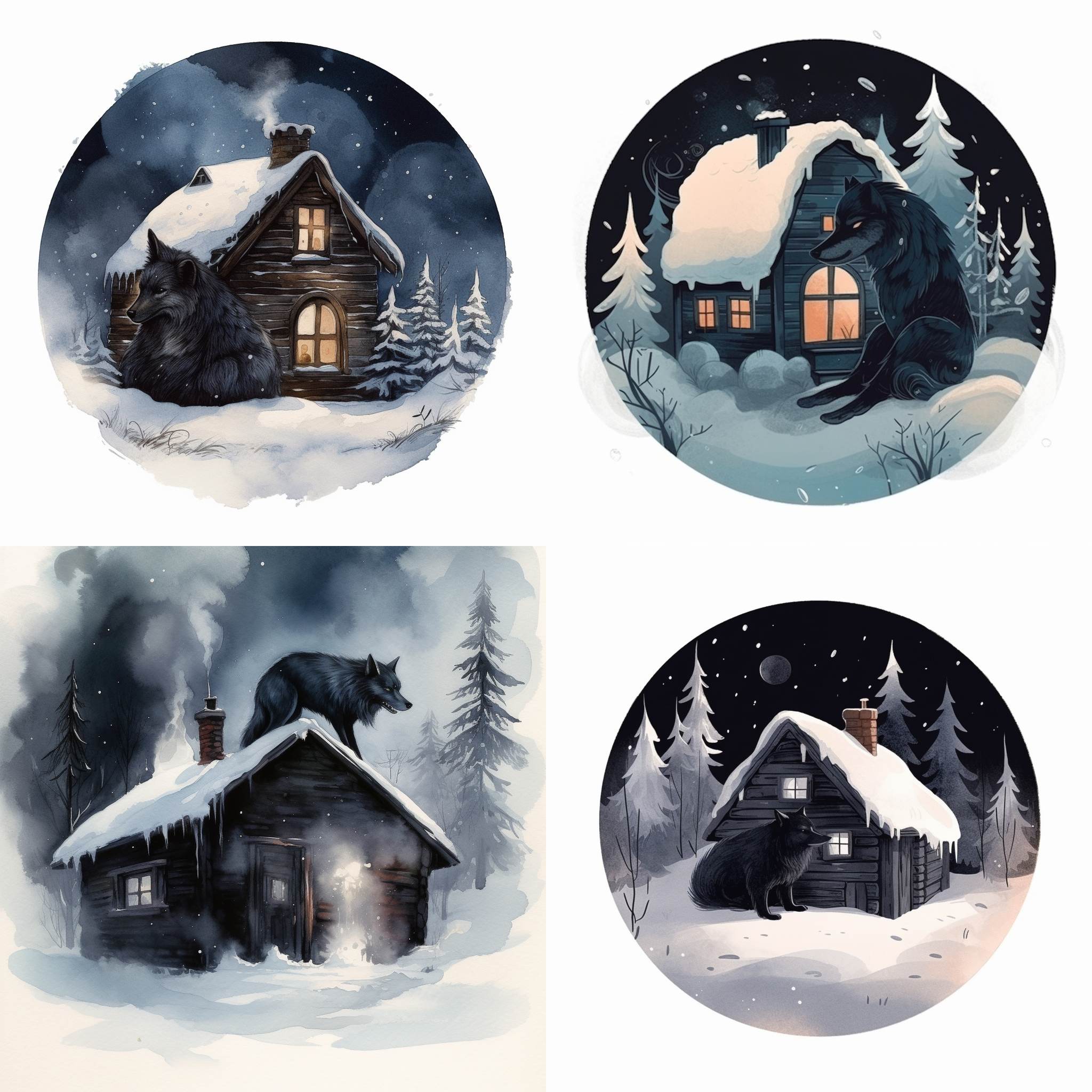А нужен был большой сказочный волк и домик стоящий у него между лап. Там ещё порядком рисунков нам миджорни предложил, вот эти одни из лучших.