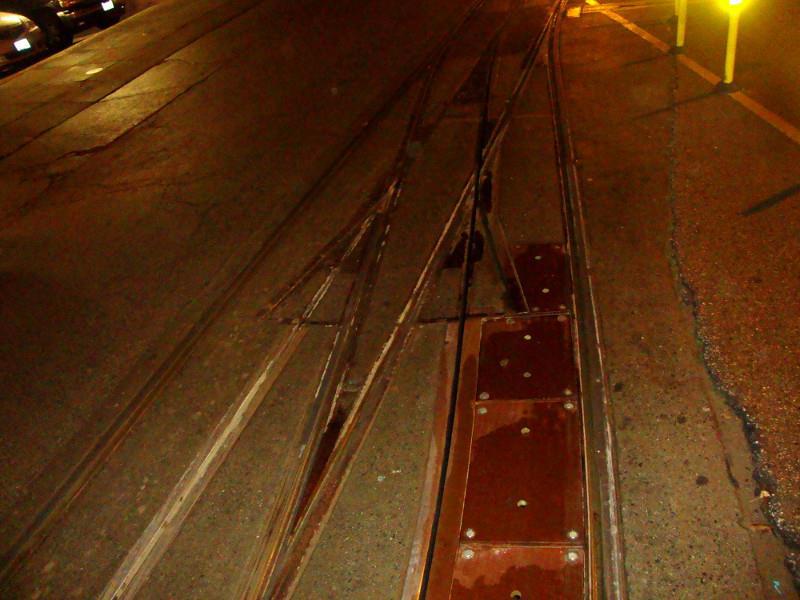 Но самое интересное и зрелищное — это как трамвайчики разворачивают на конечной остановке маршрута. Разворачивать трос так, чтоб трамвай мог бы вместе с ним развернуться было бы очень сложно, поэтому в конце каждой линии стоят вот такие круги с отрезком рельс: