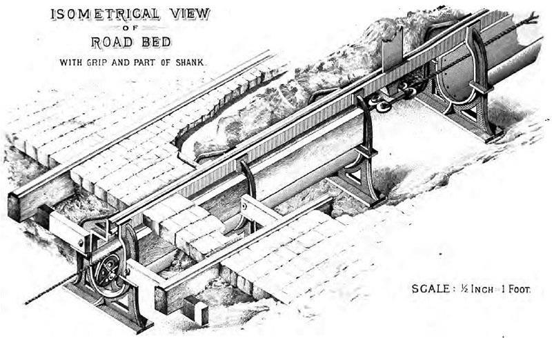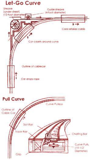 Используя скорость всего 9,5 миль в час (или около 15 км/ч), грипмэн отпускал трос и проносился сквозь него, встречаясь с тросом на другой стороне поворота. Трос уходил дальше вперед и изгибался с помощью холостого хода, к которому затем прицеплялся вагон и замедлял ход. В 1880 году на канатной дороге Саттер-стрит появилось еще одно новозеландское изобретение, известное как кривая «тяги». В отличие от той линии в «pull curve» использовалась серия подрессоренных направляющих колес, которые подгоняли трос к профилю изгиба (очень похоже на профилирование троса тележки по изгибу) и без проблем поднимали вагон вверх. Подпружиненные холостые колеса смогли самостоятельно оттолкнуться от сцепления и вернуться в исходное положение, когда вагон закончил движение.