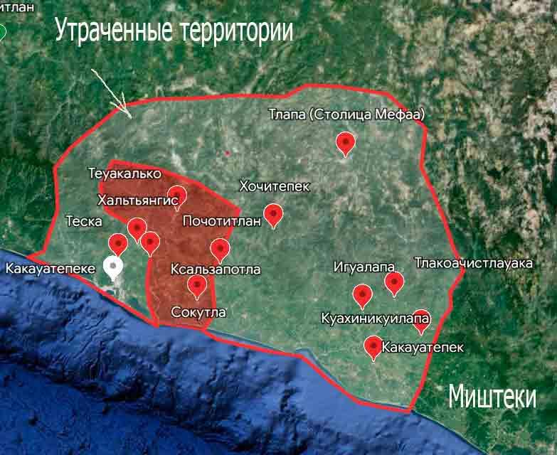 Как видите ареал куда шире чем тот огрызок на картах астекской империи. Что говорит о серьезных потерях для народа Йопи. И о большом кровопролитии.