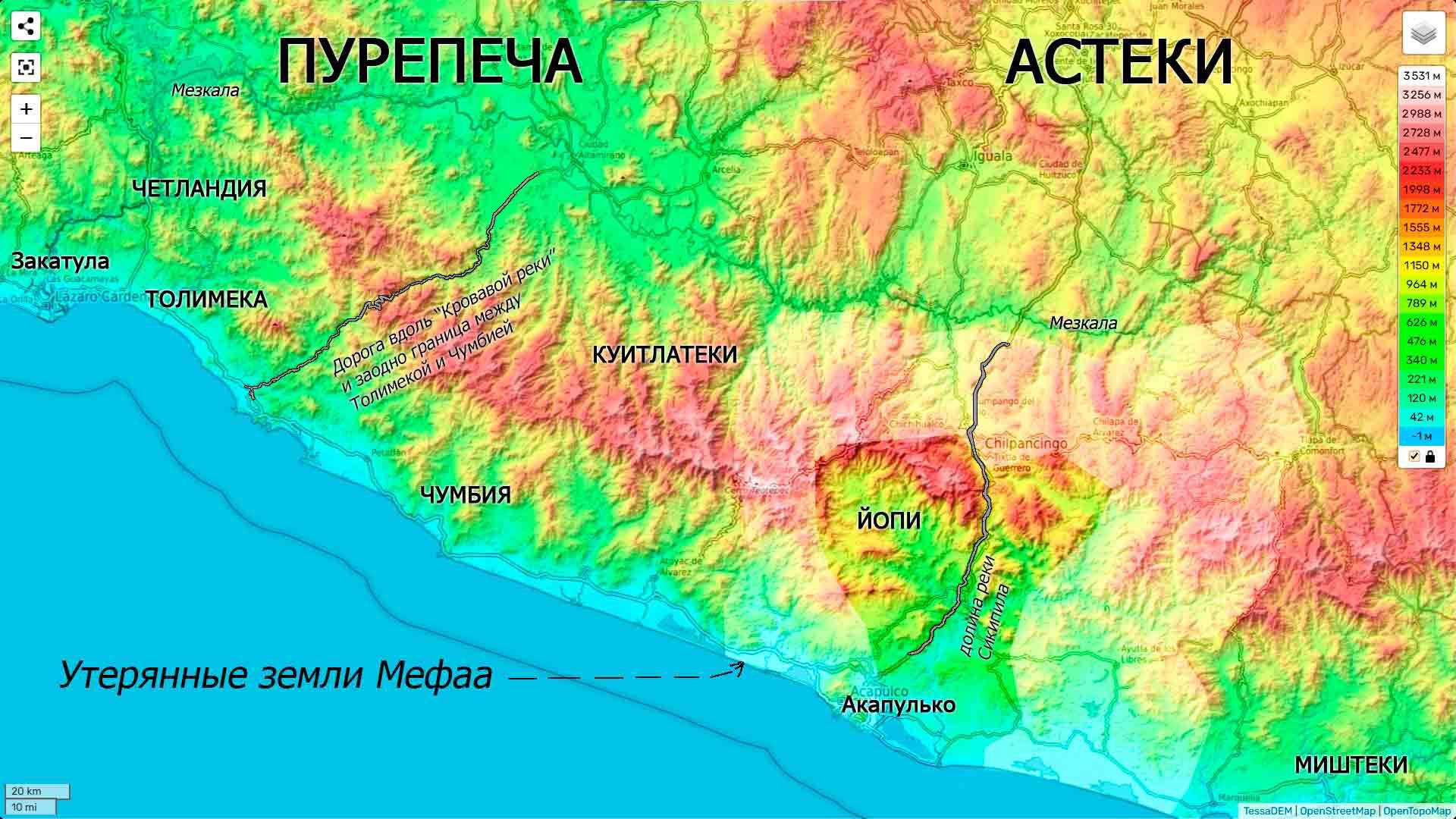 Жирненько я обвел современные автотрассы. Одна из них идет между "Толимекой" и "Чумбией" вдоль "Кровавой реки" (Той самой на которой Хуакумитла остановил нашествие астеков в 3-й книге) Именно по этому маршруту на Уекахуа внезапно обрушились астеки. А вот от Мехико до Акапулько трасса ведет по долине Сикипилы (Папагайо). И если присмотреться то это самая ровная и непетляющая трасса между океаном и глубиной континента. Не удивительно, что астеки очень хотели ее себе поиметь.