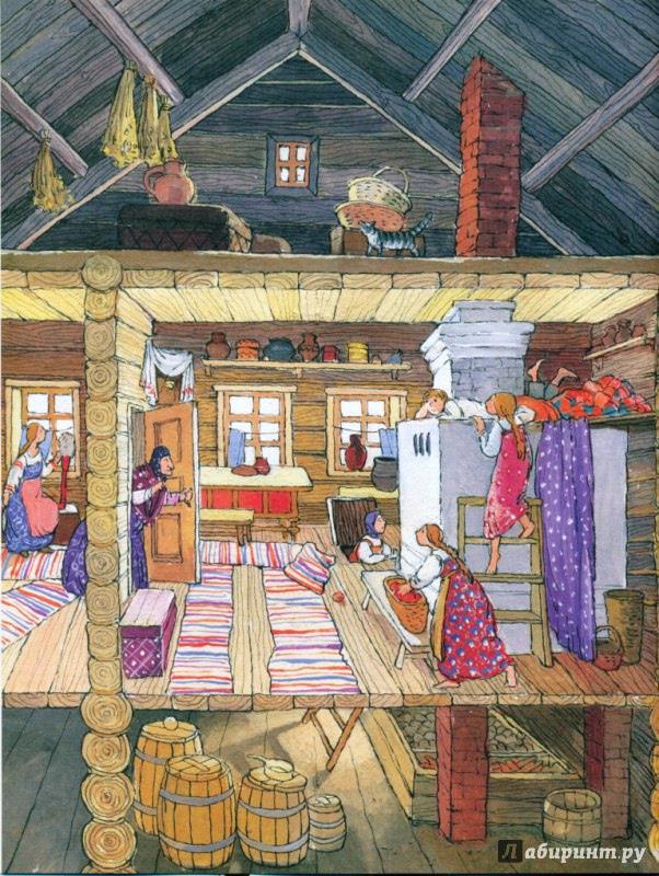 В обстановке избы нет ни одного лишнего случайного предмета, каждая вещь имеет свое строго определенное назначение и освещенное традицией место, что является характерной чертой народного жилища.