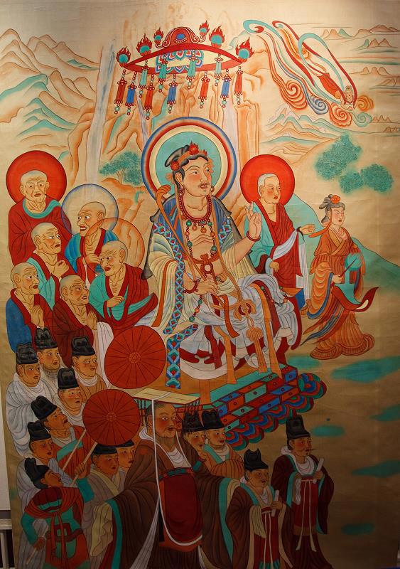 Бодхисаттва Манджушри на своём льве (оба, кстати, встречаются в «Путешествии на Запад»). В правой руке у Манджушри — жезл жуи.