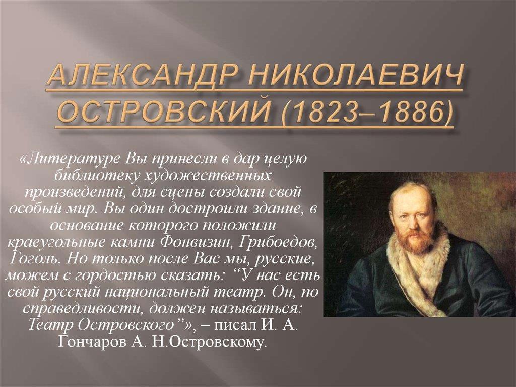 С А. Н. Островского начинается русский театр в его современном понимании: драматург создал театральную школу и целостную концепцию театральной постановки.