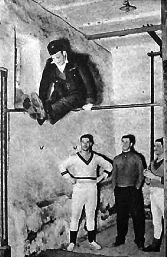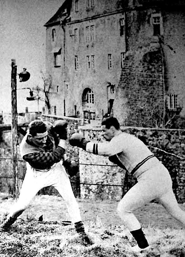 Любимый англичанами вид спорта -бокс, так-же любим и здесь. Канадец и новозеландец тренируются. На заднем плане замок который служит лагерем для военнопленных.