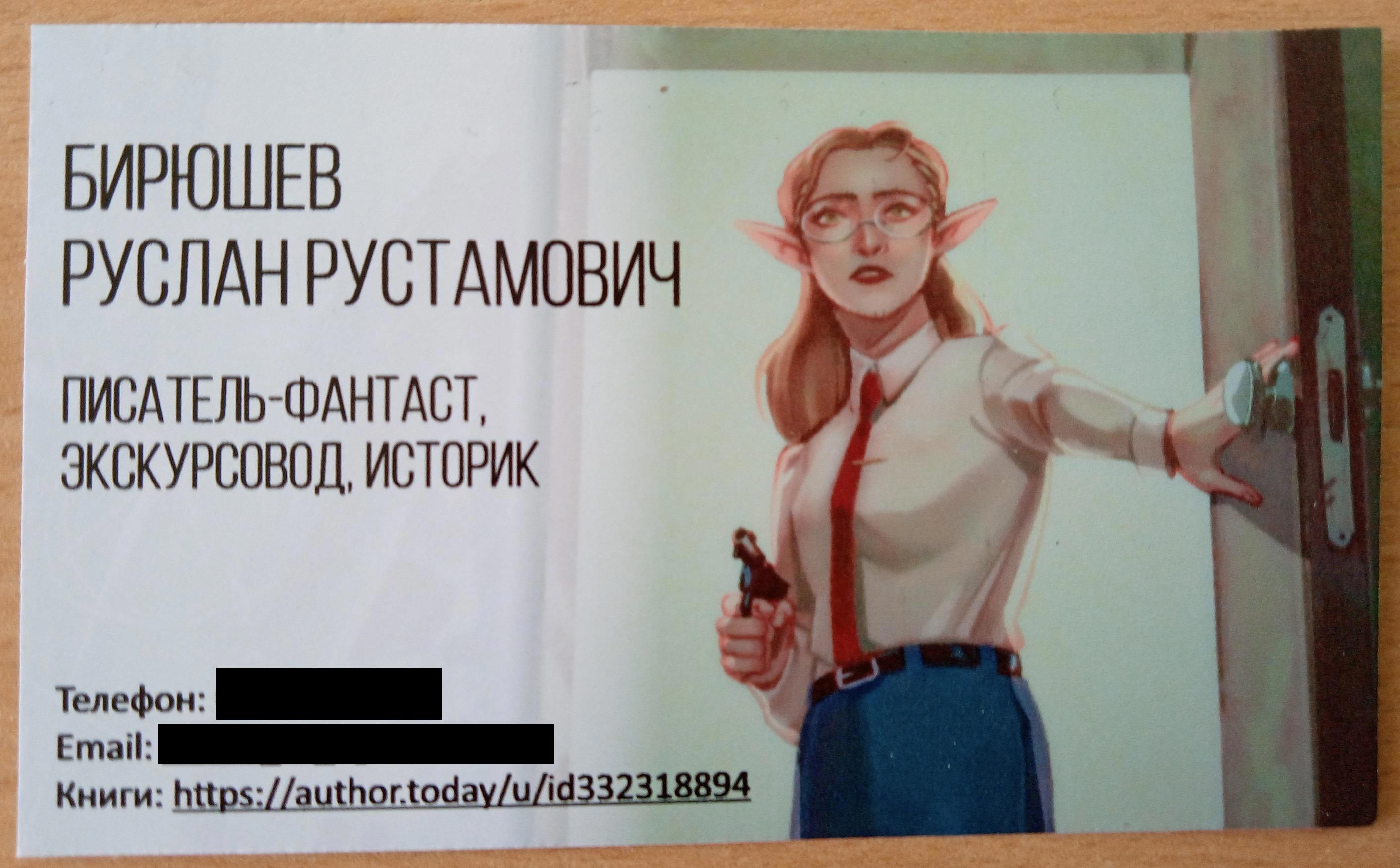 Автор: Руслан БирюшевЗа последние месяцы работы уже несколько человек спрашивали - нет ли у меня визитки? И я подумал - а почему нет, и правда? Набросал текст, взял пару иллюстраций к своим книгам, пошёл куда надо и заказал полсотни карточек. Получилось очень даже неплохо, по-моему.