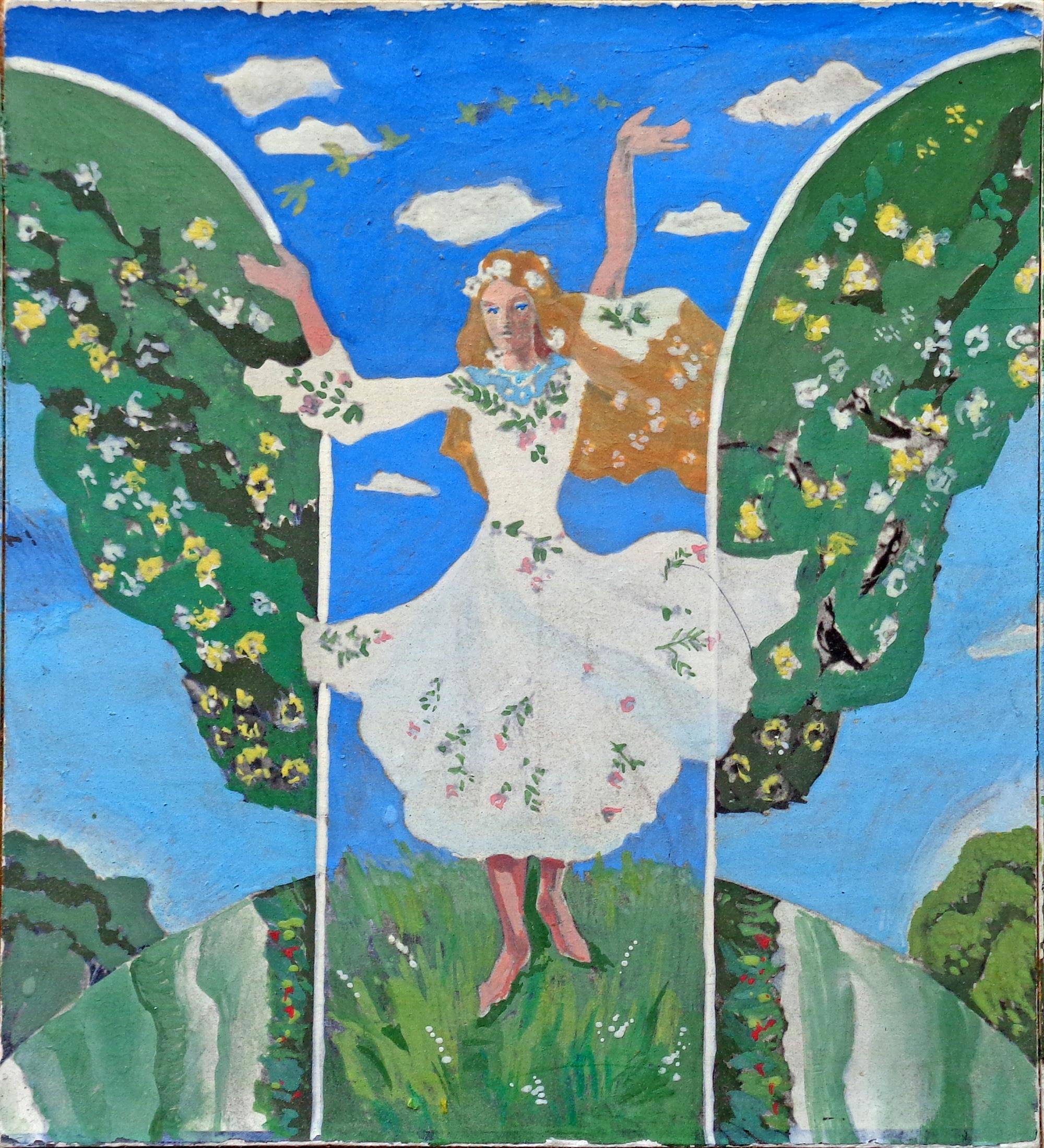 Фотографий росписи у меня нет. Зато остался самый первый эскиз. Он очень маленький - 10 на 40 см, сделан акварелью на бумаге. Понятно, что всех деталей он не передаёт. Какой там был зал, в этом ДК - я не знаю, но стены минимум несколько метров на несколько метров. Думаю, до наших дней роспись не сохранилась. Изображала она времена года и выглядела примерно так: