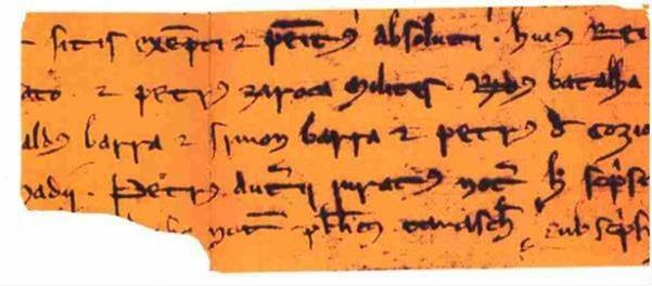 (на  иллюстрации - копия нотариального акта 1284 года, оригинал которого был  написан рукой Пейре Отье. В отрывке содержится его имя - Petrus Auterii  (предпоследняя строка слева).