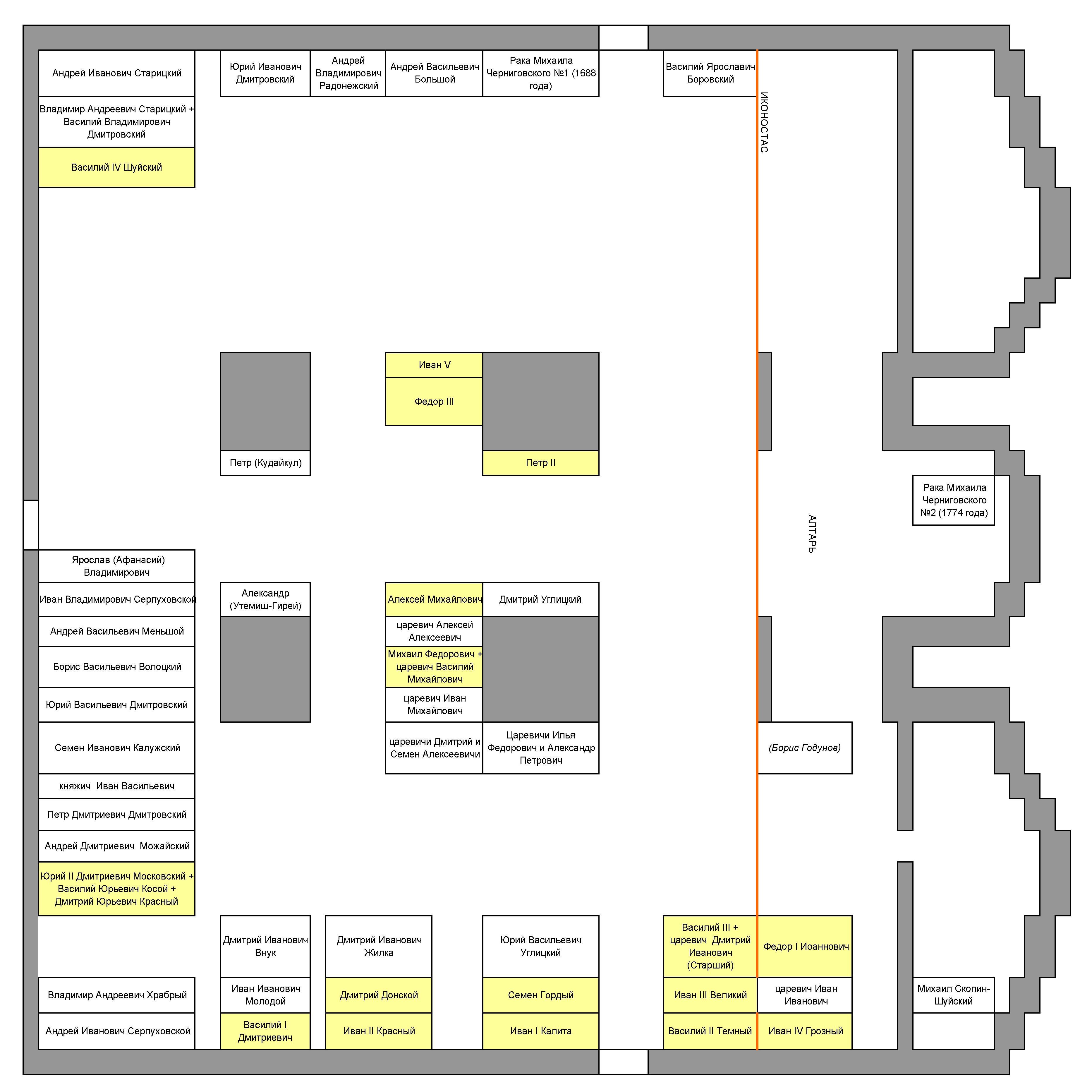 Могилы правителей расположены, в основном, вдоль южной и западной стен, вдоль северной лежат условно «опальные». Также в соборе находятся останки двух святых — Михаила Черниговского (рака в алтаре) и Дмитрия Углицкого (рака у ближнего к алтарю столпа церкви).