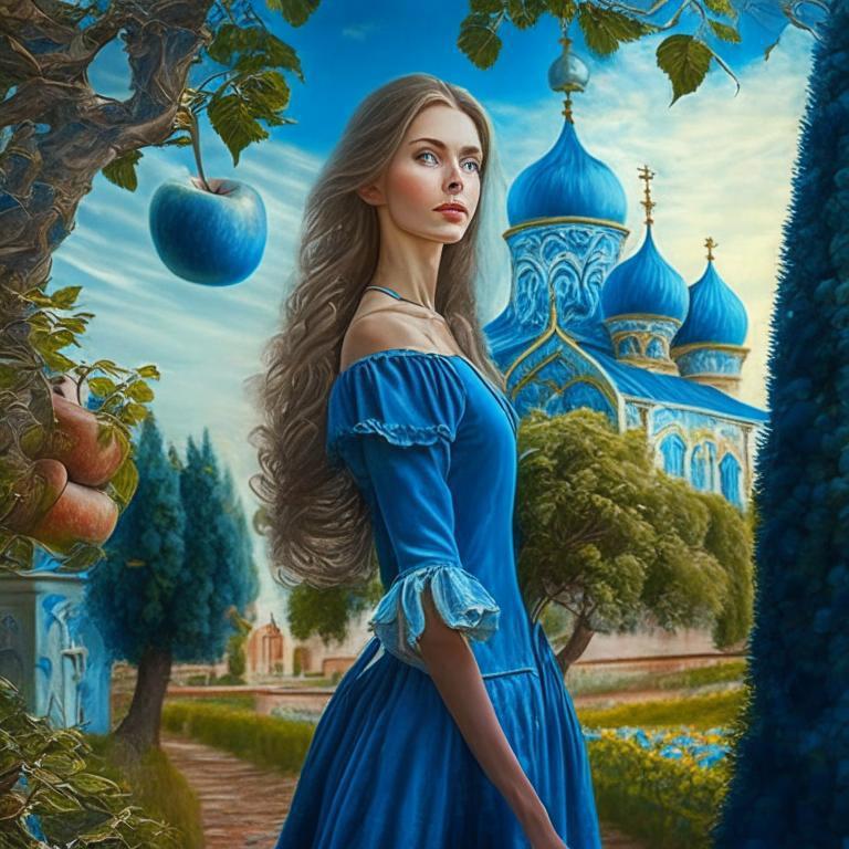 Так по мнению нейросети выглядит цветущий сад -голубые яблоки.На девушке платье,по запросу "сарафан"