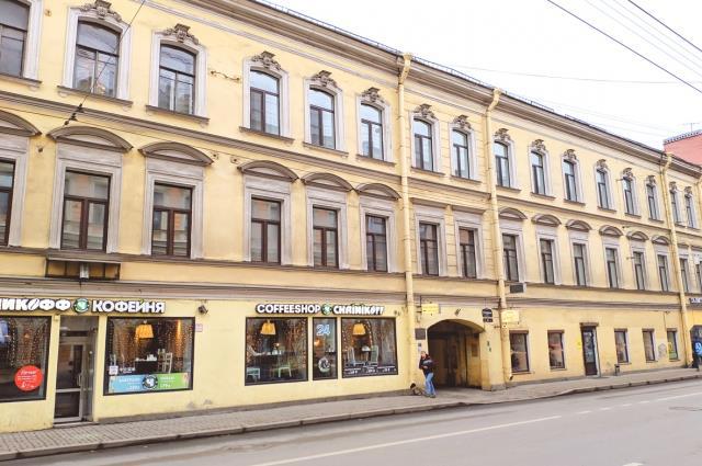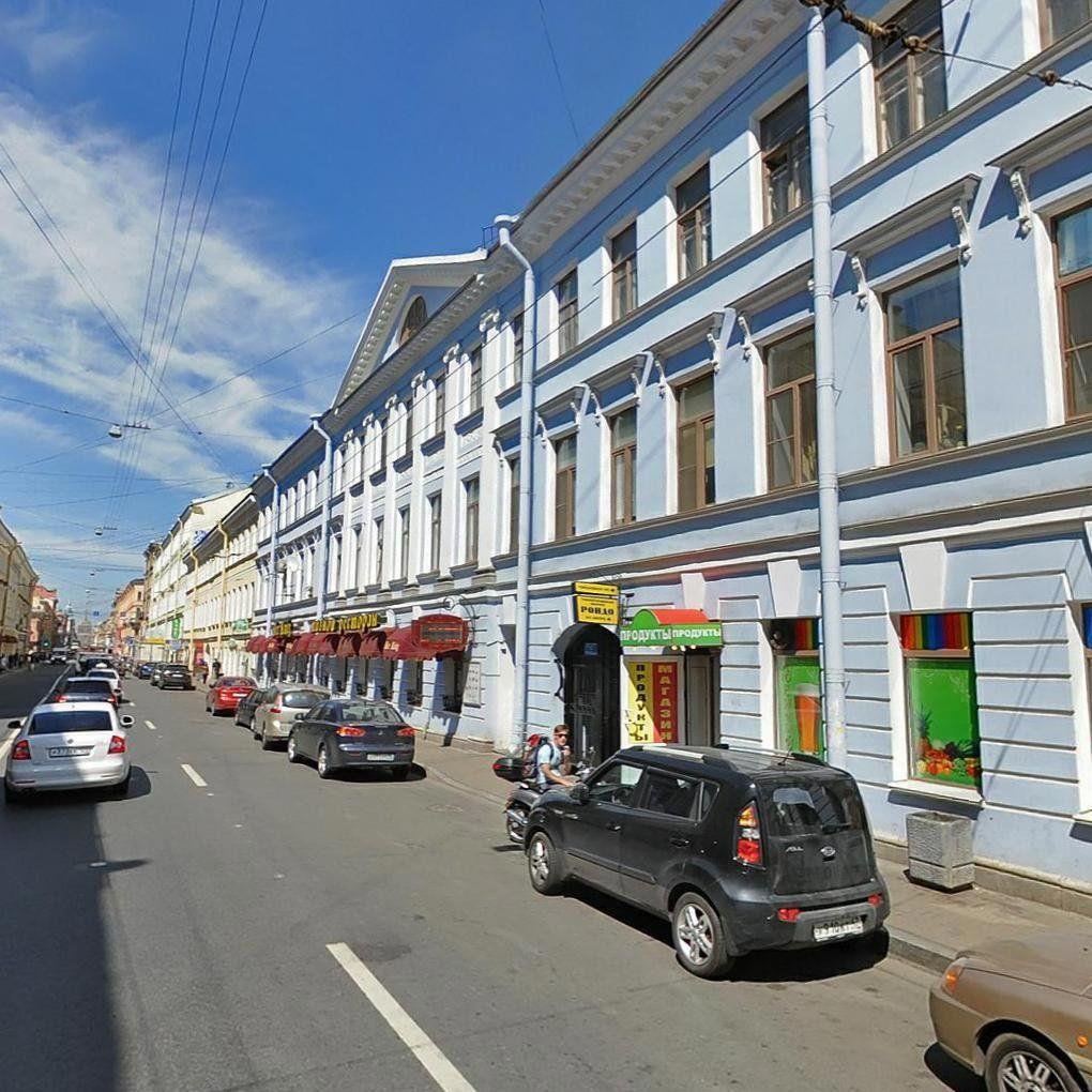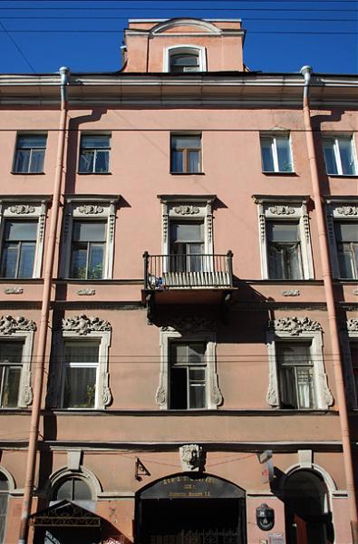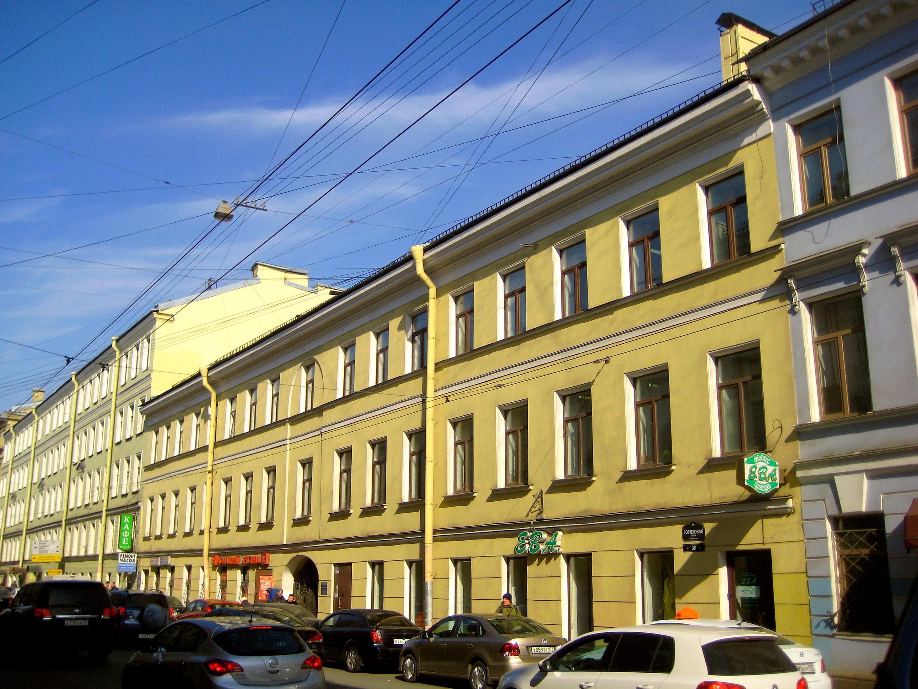 Дом А. Н. Шлегель. Построен в 1838 году, архитекторы Брюн и П. И. Висконти. Стиль — эклектика. Здесь тоже когда-то находился книжный магазин «Жук», ныне нашедший себе новое пристанище в Апраксином переулке.