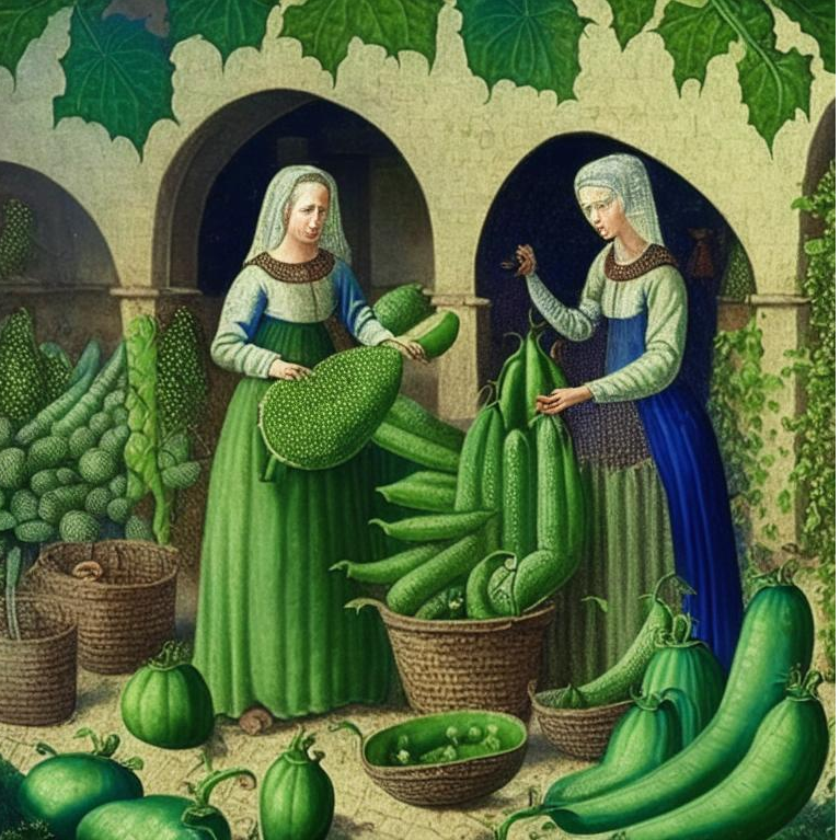 И напоследок. Я задала простой запрос — нарисовать обычный огурец в средневековом стиле. И вот что мне выдал Кандинский.