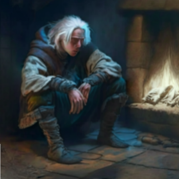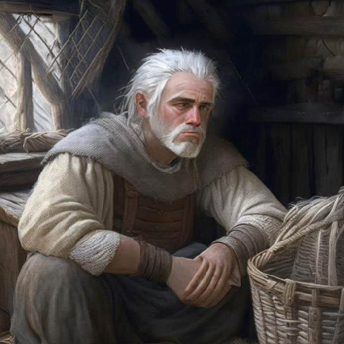 Но лучше этот персонаж получился на другой иллюстрации (там пришлось убирать лишние руки и пальцы). Действие происходит тремя месяцами ранее. Персонаж сидит, действительно плетет корзину и думает, как теперь жить.