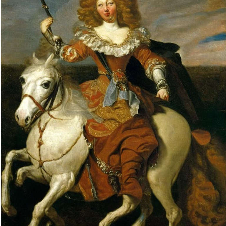 P.S. А вот нейросеть ответила на запрос "Белокурая герцогиня де Лонгвиль верхом на белом коне". Я ничего не правила — править тут только портить :)