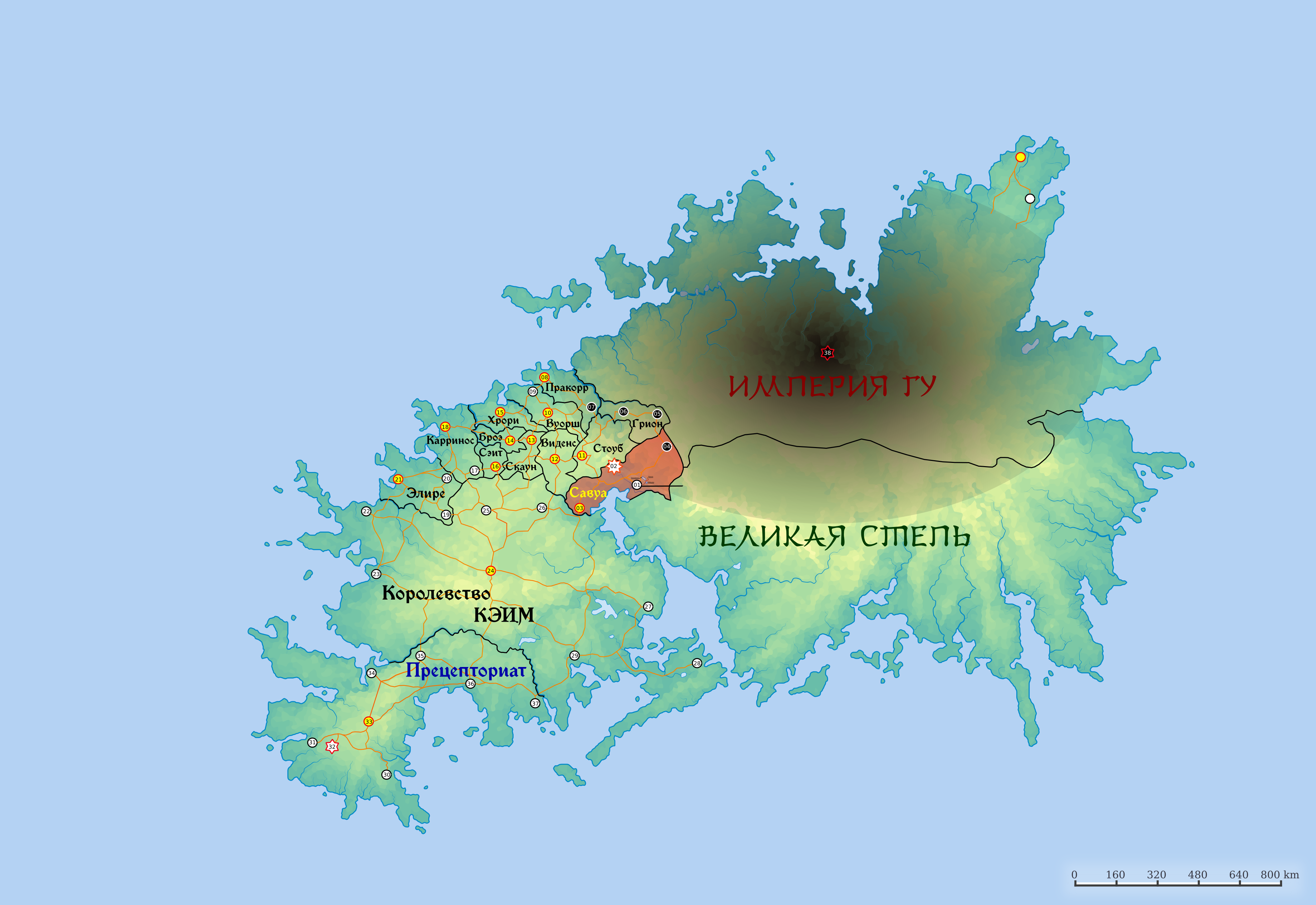 Автор: Лопарев ИгорьРаботаю над новой книгой. И в связи с этим озаботился систематизацией, ибо в голове всё держать напряжно. Слишком много мелочей. А действие должно развиваться непротиворечиво. То есть рельеф местности не должен изменяться самопроизвольно. Границы не должны извиваться, а города кочевать, если эта способность не включена в их ТТХ. Одним из инструментов упорядочивания происходящего является карта, содержащая в себе максимум пространственной информации. И, кажется я таки решил для себя эту проблему. Т.е. генерируется физическая карта (я генерю на сайте https://azgaar.github.io/Fantasy-Map-Generator - есть и другие)....а потом на неё наносятся границы, располагаются города и государства....можно добавлять слои с различной дополнительной информацией. Исходник делается в векторе. Вот. Сделал проект, экспортировал в пнг. На мой взгляд получилось относительно прилично.