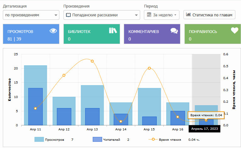 2. Почему количество просмотров на графике часто не соответствует количеству просмотров по главам в таблице? Например, на графике сегодня у меня по одной книге показывает 66 просмотров, а в таблице - 20 просмотров на странице книги и около 15 заходов в разные главы, что в сумме никак не 66...