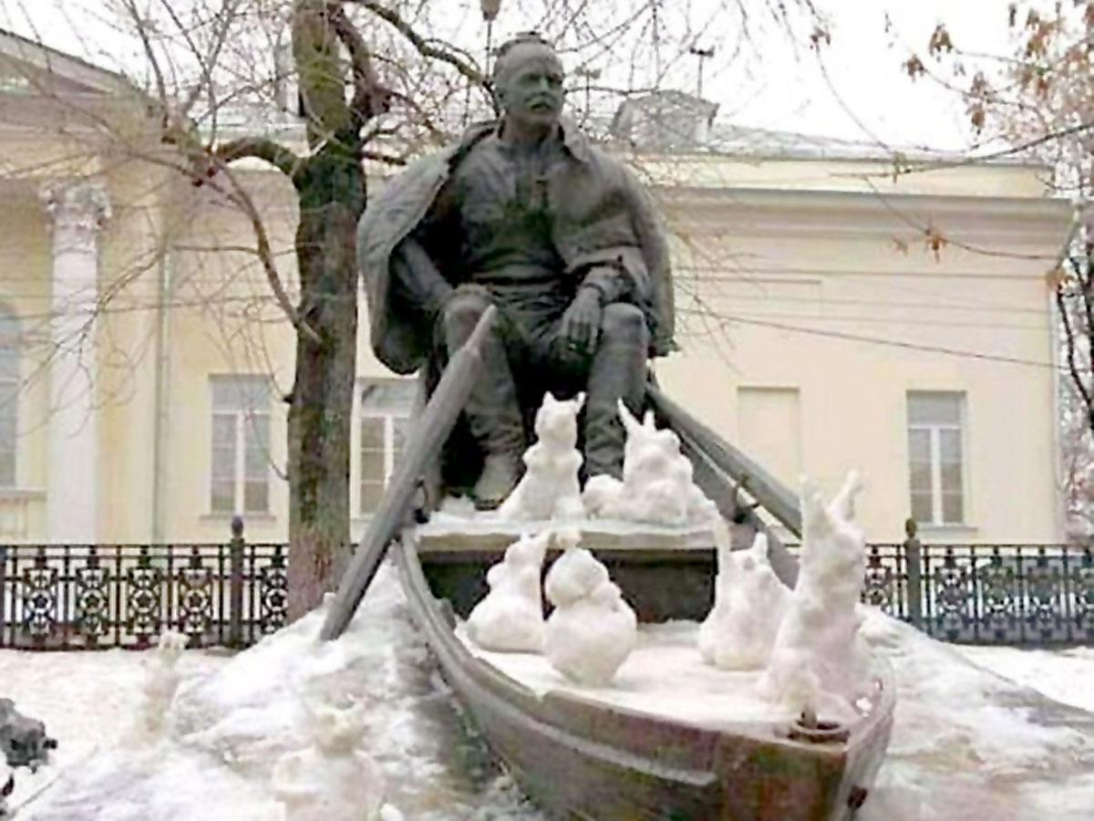 Москва, памятник Шолохову имеет даже два прозвища и одну доработку. Летом он «Кони в бетоне», а зимой — «Дед Мазай»: