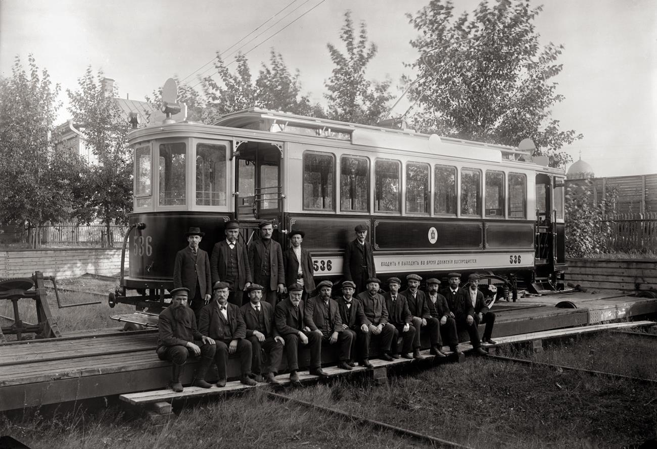 Автор: ИмпиГруппа мастеров вагонного завода возле трамвая, завод «Сормово», Нижний Новгород, 1910