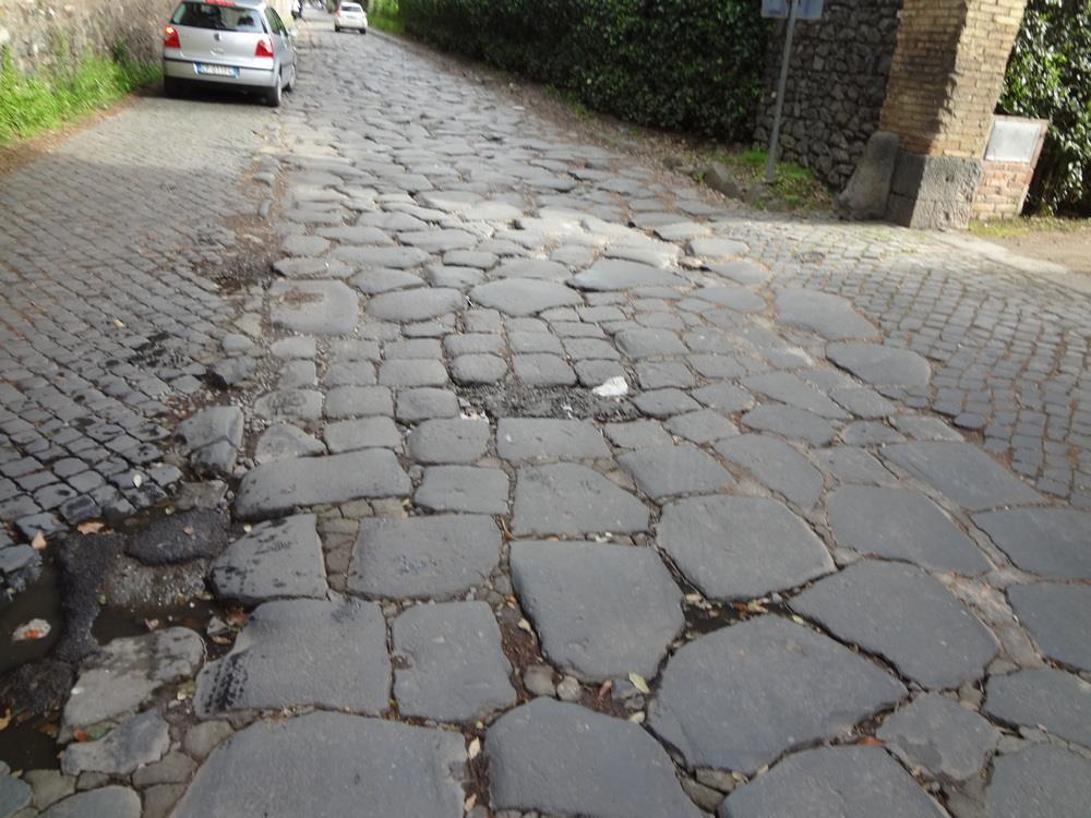 А это Аппиева дорога, которая ведет к катакомбам. Чудовищно древняя, вполне рабочая, итальянцы по ней шпарят лихо, потому пешим там ходить как-то неуютно.