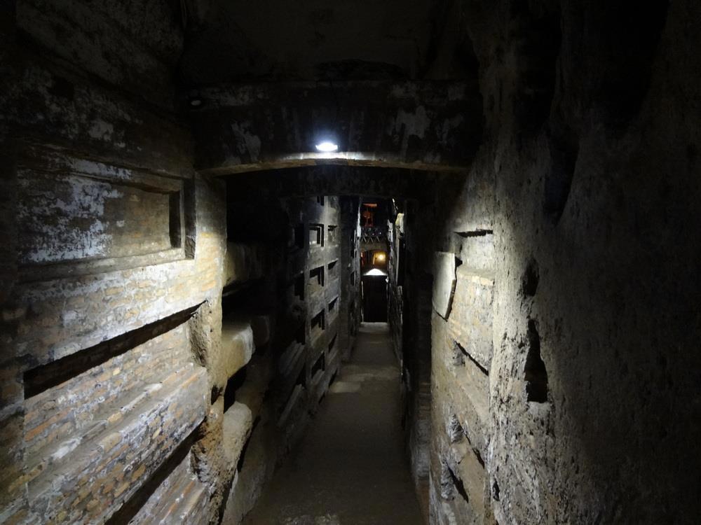 Все ниши пустые - так как первые христиане - все святые по определению, то все останки и артефакты католической церковью были под метлу выбраны полностью - и все найденное отправилось в виде мощей по всему миру. Останки из Рима особо ценились - там святость выше. А требовалось реликвий много - католики по всему свету есть.
