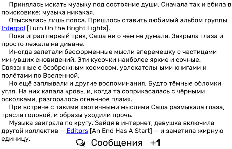 Автор: Денисова СашаБывают такие сцены, когда герои слушают музыку. Для усиления атмосферности, можно мимоходом подсказывать название. Тогда кто-то из читателей включит её у себя и тоже начнёт слушать. Это создаст определённое настроение, которое поможет больше раскрыть героя. Мы словно проживаем вместе с ним эту главу. Находимся на одной волне. Пример из книги ВМВЭА: