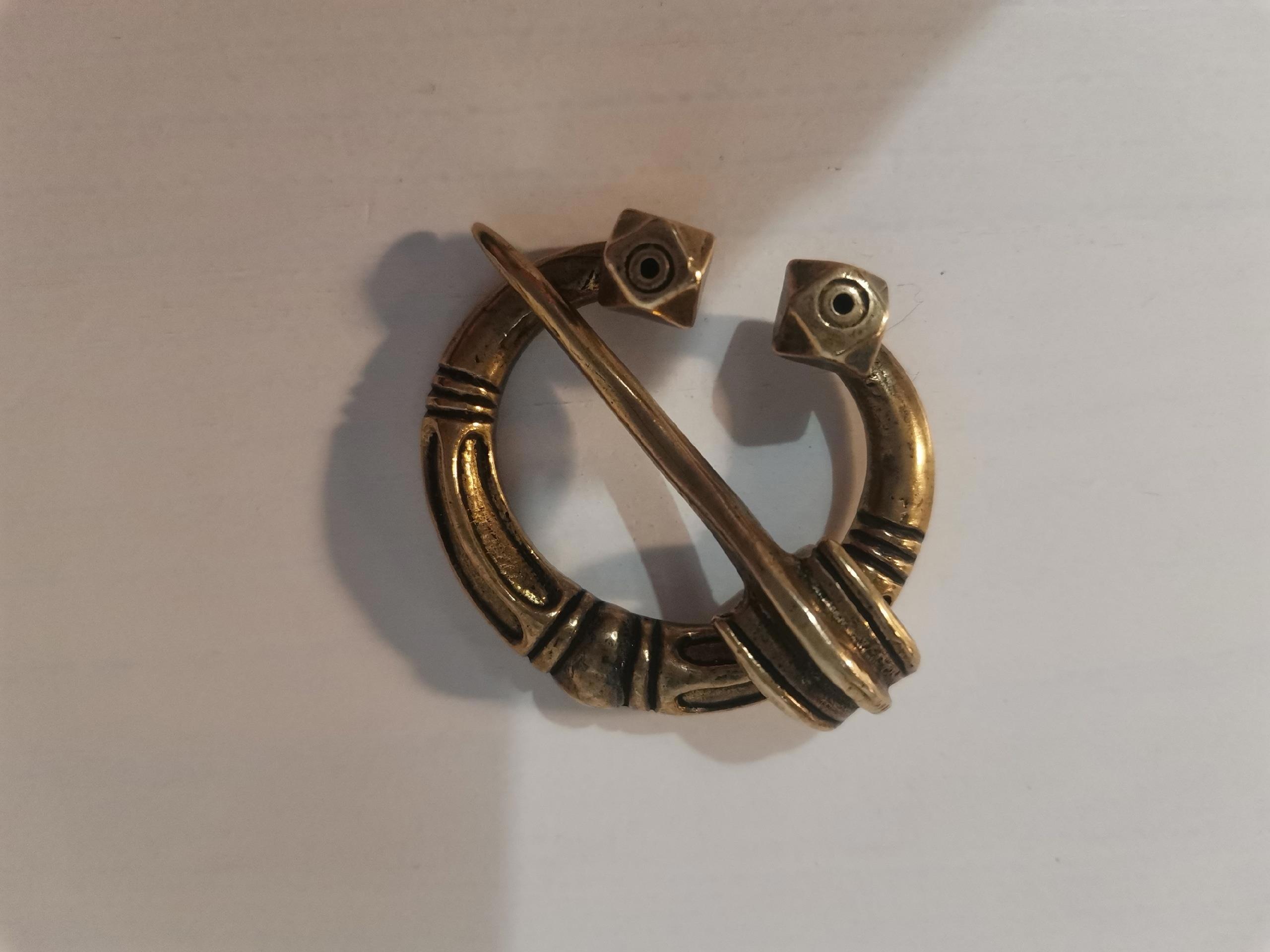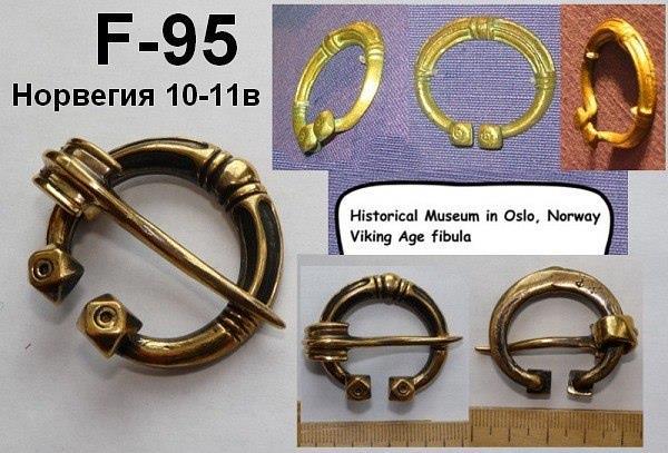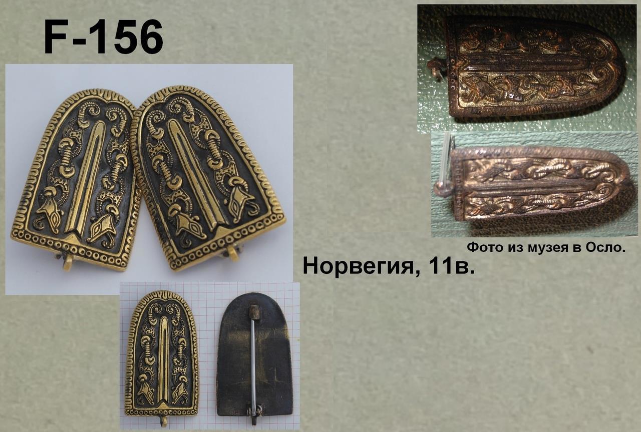 Здесь мы видим парные фибулы. Это реконструкция археологической находки, сделанной в Норвегии, датируется XI веком. Предположительно изначально это пряжка англосаксонского ремня, переделанная скандинавами в фибулу. Вот картинка из музея в Осло и современная реконструкция: