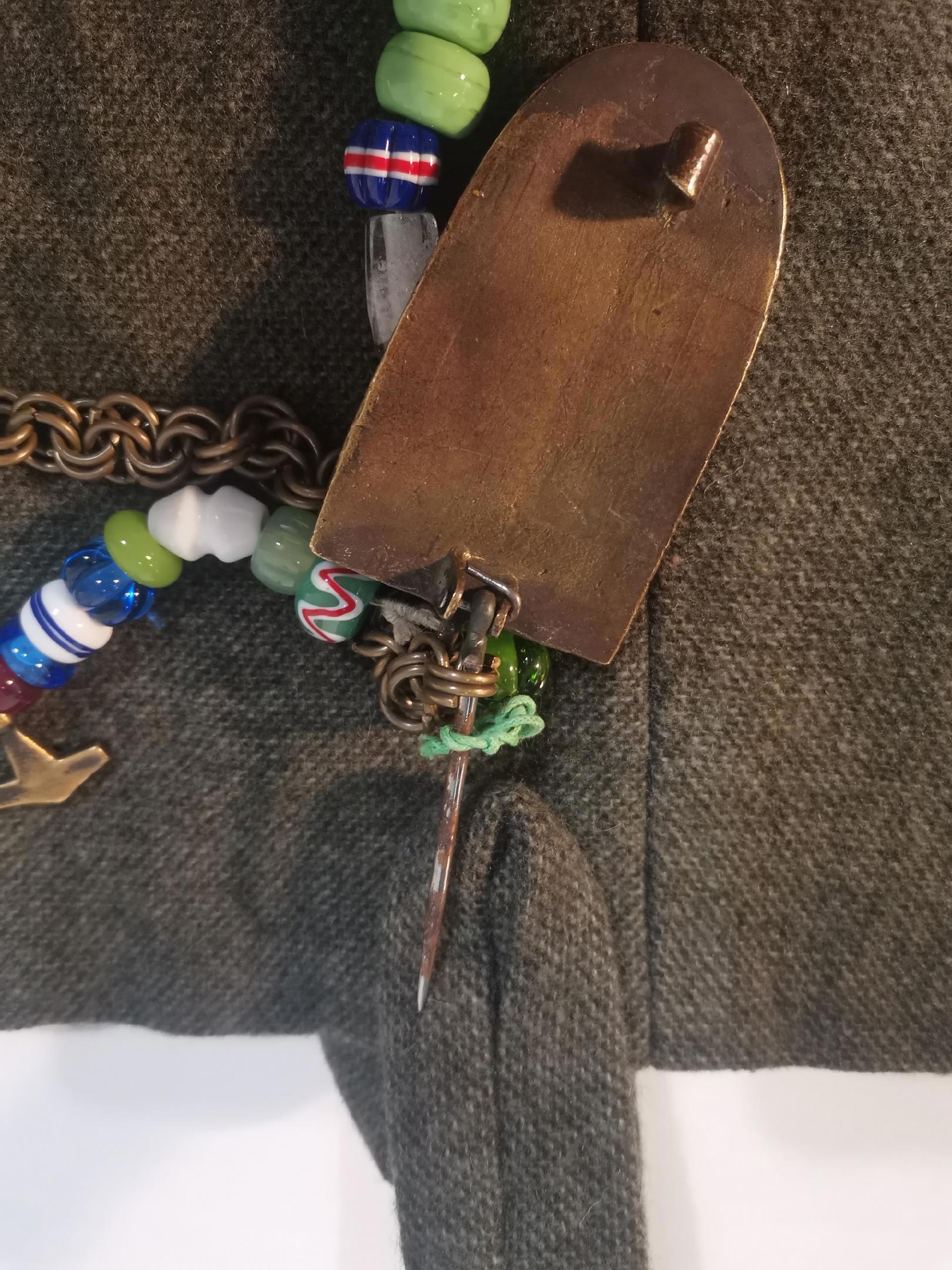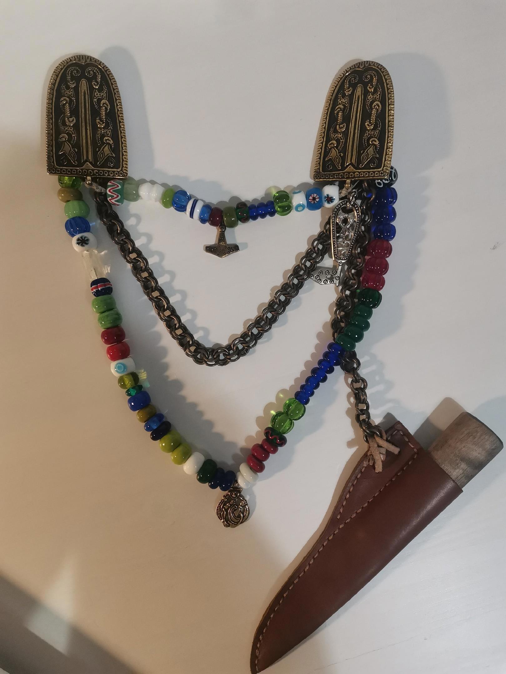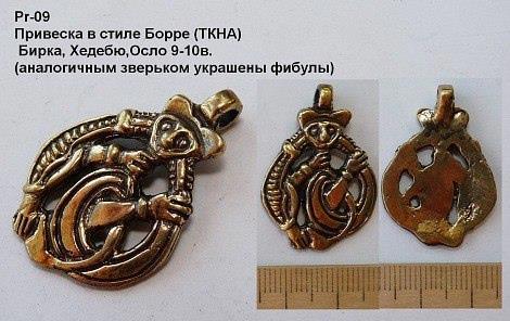 Дальше мы видим цепь (ношение таких цепей характерно для Норвегии эпохи викингов), две нитки стеклянных бус (реконструкция бус на Норвегию по археологическим находкам). Картинки находок у меня есть, но их много, приводить здесь не буду. Две привески: молот Тора (на Норвегию X-XI вв.) и привеска в виде хватающегося зверя в стиле Борре (такие привески находили в Норвегии, Хедебю (Дания), Бирке (Швеция), IX-X вв.):