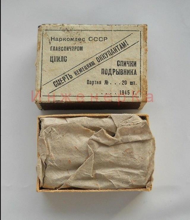 Укупорка. Каждая спичка обернута парафинированной бумагой. 20 спичек уложены в картонный коробок. 36 коробков уложены в герметичную металлическую коробку. 2 коробки уложены в деревянный ящик размерами 42.5 на 34.0 и на 15.5 см.