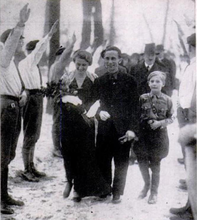 Он женился на своей секретарше Магде Квандр в1931 - Гитлер марширует позади них по пути на свадьбу между рядами штурмовиков. Сын его жены от предыдущего брака, одетый в нацистскую форму, идет рядом с Геббельсом. Отчим фрау Геббельс был евреем
